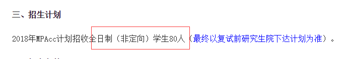 這是對(duì)外經(jīng)濟(jì)貿(mào)易大學(xué)2018年MPAcc的招生簡章(上次有同學(xué)留言提到了的),去年的招生計(jì)劃是“全日制50人,非全日制93人”。全日制的招生計(jì)劃沒有改變,非全日制的倒是減少了。