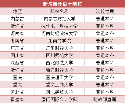 2018年3月22日,教育部發(fā)布了《國務(wù)院學(xué)位委員會關(guān)于下達(dá)2017年審核增列的博士、碩士學(xué)位授權(quán)點名單的通知》,明確提到的新增審計碩士院校共計12所,具體名單如下: