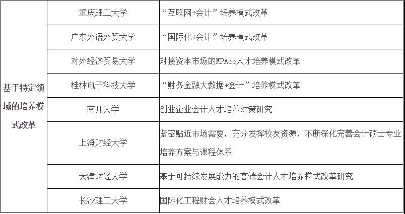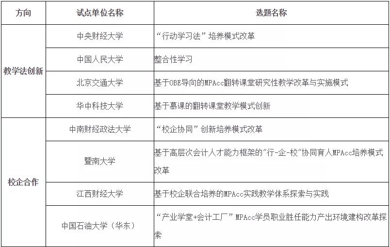 會計教指委邀請了16家培養(yǎng)單位參與深化綜合改革試點工作,改革試點方向包括教學法創(chuàng)新、校企合作以及基于特定領(lǐng)域的培養(yǎng)模式改革: