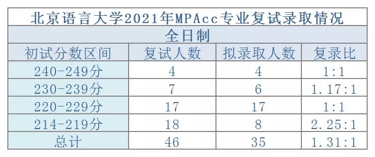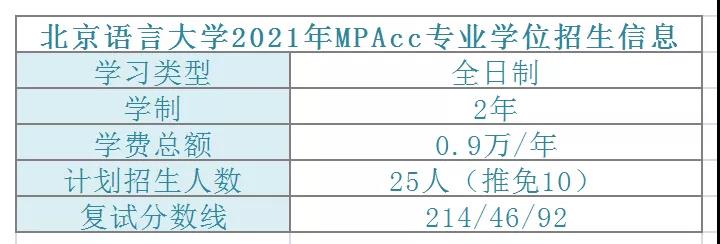 全日制 北京語言大學(xué)是國家教育部直屬高校,是一所以語言教學(xué)為優(yōu)勢(shì)和特色、涵蓋中外語言文學(xué)、經(jīng)濟(jì)學(xué)、管理學(xué)、工學(xué)、法學(xué)等學(xué)科的綜合性大學(xué),是我國唯一一所以來華留學(xué)生為主要生源的國際型大學(xué)。 北京語言大學(xué)會(huì)計(jì)專業(yè)碩士研究生教育項(xiàng)目依托學(xué)校多元文化背景和國際化環(huán)境,充分利用學(xué)校特有的“小聯(lián)合國”氛圍和學(xué)院路共同體地域優(yōu)勢(shì),舉全校會(huì)計(jì)、金融、國貿(mào)、人力資源、信息管理、對(duì)外漢語、英語等多個(gè)領(lǐng)域、多名教師之力,共同打造獨(dú)具特色的國際化MPAcc項(xiàng)目。 從2015年起,北京語言大學(xué)商學(xué)院開始招收會(huì)計(jì)專業(yè)碩士研究生,學(xué)制兩年,授予會(huì)計(jì)碩士學(xué)位。 2021年MPAcc專業(yè)招生信息 北京語言大學(xué)2021年MPAcc專業(yè)全日制計(jì)劃招生25人,其中含推免10人,學(xué)制2年。 2021年MPAcc專業(yè)錄取情況 北京語言大學(xué)2021年MPAcc專業(yè)一志愿進(jìn)入復(fù)試46人,最高分24分,最低分214分;擬錄取35人,最高分246分,最低分214分。 2021年MPAcc專業(yè)一志愿擬錄取名單 復(fù)試考核 復(fù)試成績占總成績的40%;初試成績占總成績的60%。 復(fù)試內(nèi)容 1. 外語聽力及口語測(cè)試(占復(fù)試成績的 20%) 外語聽力及口語測(cè)試主要測(cè)試考生的聽力、理解力、反應(yīng)速度、語言表達(dá)的準(zhǔn)確度及流暢度,按百分制打分。 2. 專業(yè)綜合能力測(cè)試(占復(fù)試成績的 80%) 專業(yè)綜合能力測(cè)試旨在對(duì)復(fù)試考生的專業(yè)知識(shí)和分析能力、發(fā)展?jié)摿Φ人刭|(zhì)進(jìn)行考察與測(cè)試。專業(yè)綜合能力測(cè)試由各專業(yè)組成復(fù)試組(一般為 5 人),按百分制打分。 同等學(xué)力考生需加試2門本科階段主干課程,考試采用閉卷筆試方式進(jìn)行,按百分制打分,不計(jì)入復(fù)試成績。會(huì)計(jì)碩士需按要求進(jìn)行思想政治理論考核,考核在專業(yè)綜合能力測(cè)試中進(jìn)行,成績計(jì)入總成績。
