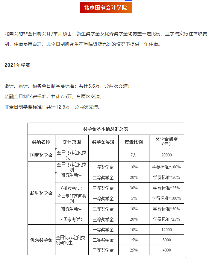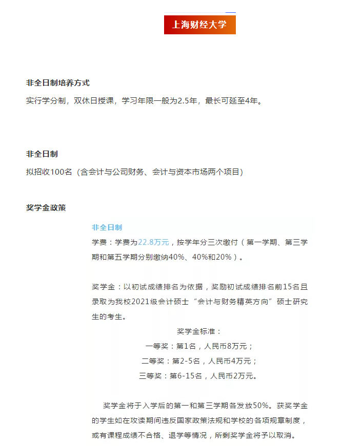 在大部分院校的非全日制會(huì)計(jì)碩士招生簡(jiǎn)章中,都會(huì)明確標(biāo)注“非全日制碩士研究生按相關(guān)規(guī)定和標(biāo)準(zhǔn)繳納學(xué)費(fèi),不享受各類獎(jiǎng)助金”,“非全日制碩士研究生不享受任何以上獎(jiǎng)助政策”。