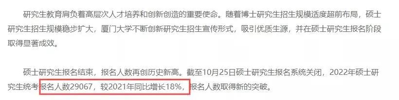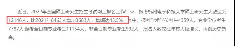 新公布報(bào)考人數(shù)的院校▼ 今年青島大學(xué)共有17734名統(tǒng)考生,較去年增長了2584人,增幅達(dá)17.1%。 其中學(xué)術(shù)學(xué)位報(bào)考人數(shù)共計(jì)3647人,專業(yè)學(xué)位報(bào)考人數(shù)共計(jì)14087人。 杭州電子科技大學(xué) 報(bào)考杭州電子科技大學(xué)碩士研究生人數(shù)達(dá)到12146人,比2021年的8463人增加3683人,增幅達(dá)43.5%。 其中報(bào)考學(xué)術(shù)學(xué)位考生4359人,專業(yè)學(xué)位考生7787人;報(bào)考全日制專業(yè)考生11154人,非全日制專業(yè)考生992人。報(bào)名人數(shù)較往年有大幅增長,再創(chuàng)歷史新高。 截止10月19日,報(bào)考該校2022全國碩士研究生考生達(dá)到13275人,比上年增加24.9%,報(bào)名人數(shù)還在持續(xù)增加。