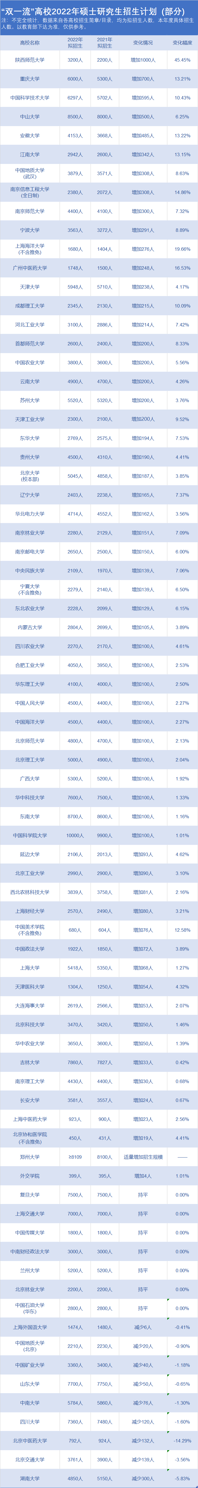 而陜西師范大學(xué)、重慶大學(xué)、中國科學(xué)技術(shù)大學(xué)、中山大學(xué)等院校進行了擴招,陜西師范大學(xué)擴招比例達到了45.45%,將近一半。所以報考該院校的同學(xué)機會相對大了些哦。(以上僅為部分數(shù)據(jù),僅供參考。還有很多院校暫未統(tǒng)計,一切以官方發(fā)布的為準~)