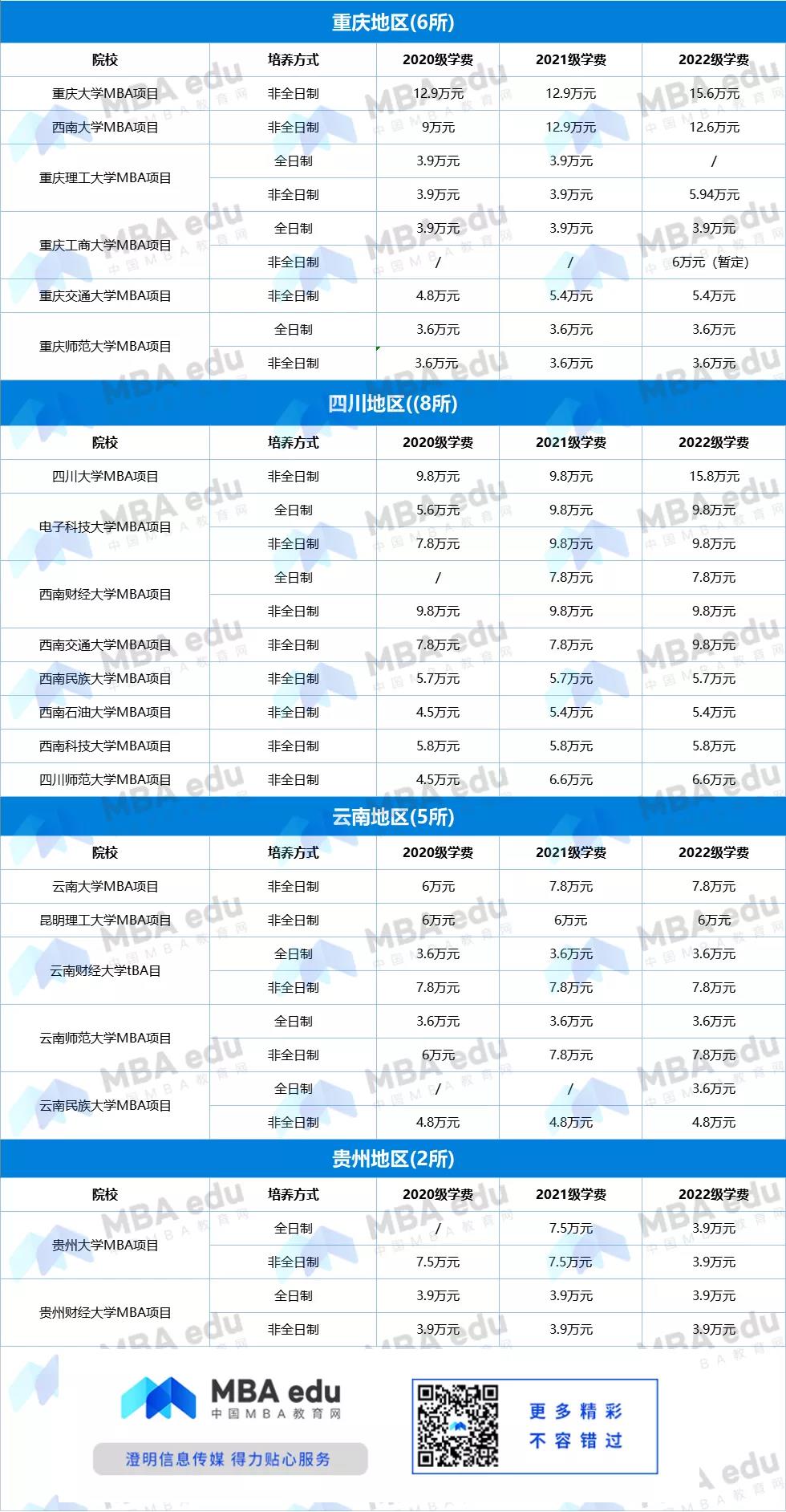 西南地區(qū)MBA近3年學(xué)費浮動表