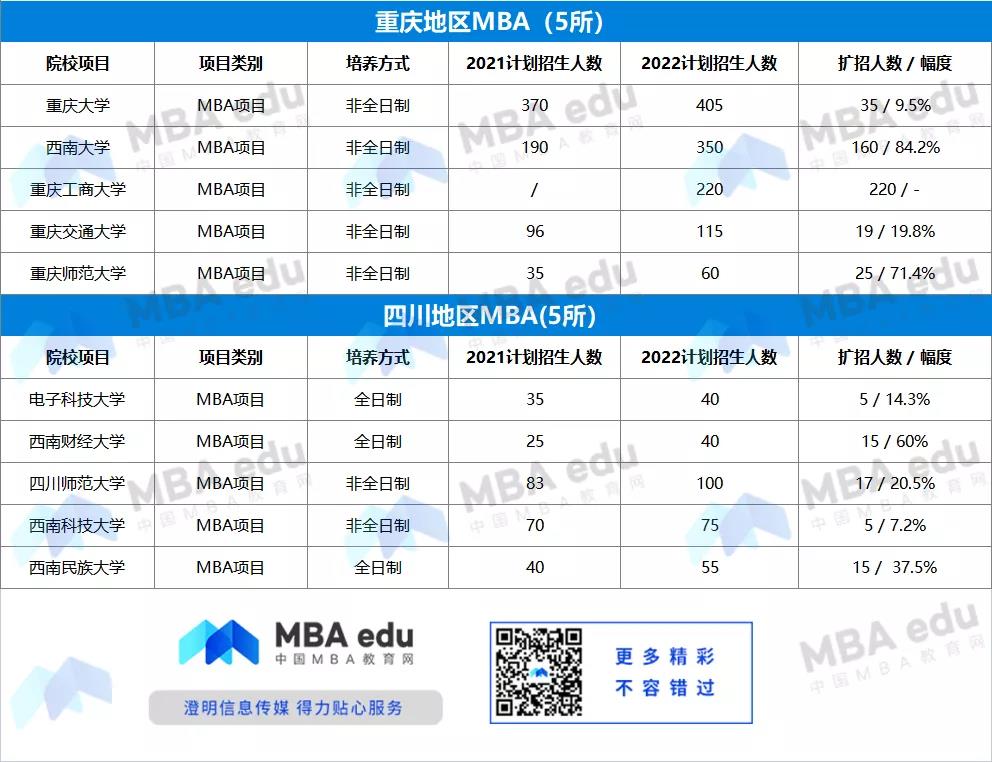 西南地區(qū)共有10所院校在今年有不同程度的擴招,其中西南大學(xué)非全日制MBA,去年計劃招生人數(shù)190人,今年擴招至350人,擴招160人,增幅84.2%。