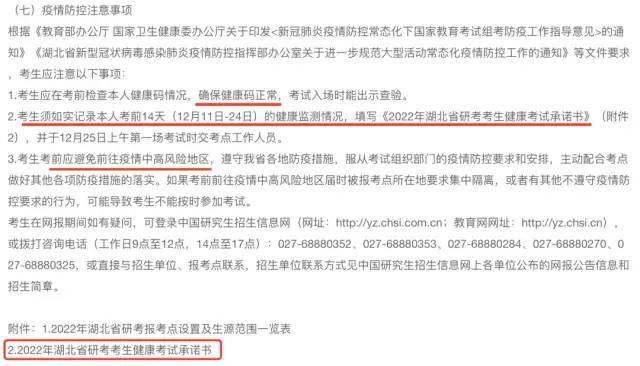 考生須如實記錄本人考前14天(12月11日-24日)的健康監(jiān)測情況,填寫《2022年湖北省研考考生健康考試承諾書》,并于12月25日上午第一場考試時交考點工作人員。