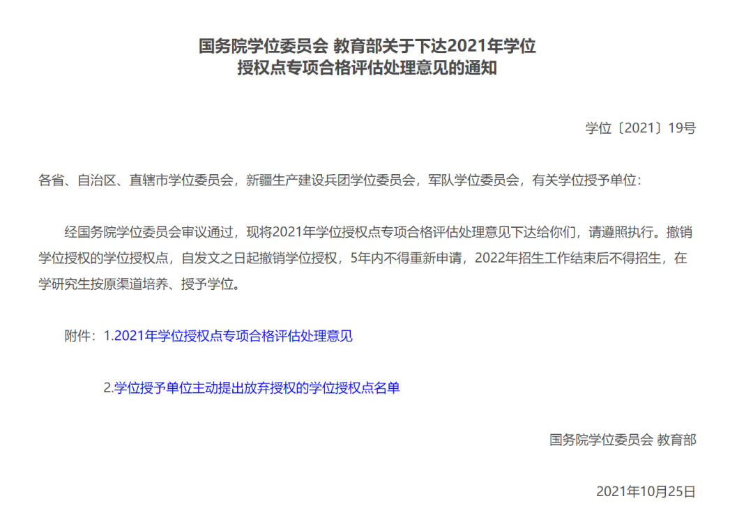 2019年,教育部下發(fā)了《國務(wù)院學(xué)位委員會教育部關(guān)于下達(dá)2018年學(xué)位授權(quán)點(diǎn)專項(xiàng)評估結(jié)果及處理意見的通知》。通知公布了2018年學(xué)位授權(quán)點(diǎn)專項(xiàng)評估結(jié)果和學(xué)位授予單位主動提出放棄授權(quán)的學(xué)位授權(quán)點(diǎn)名單。