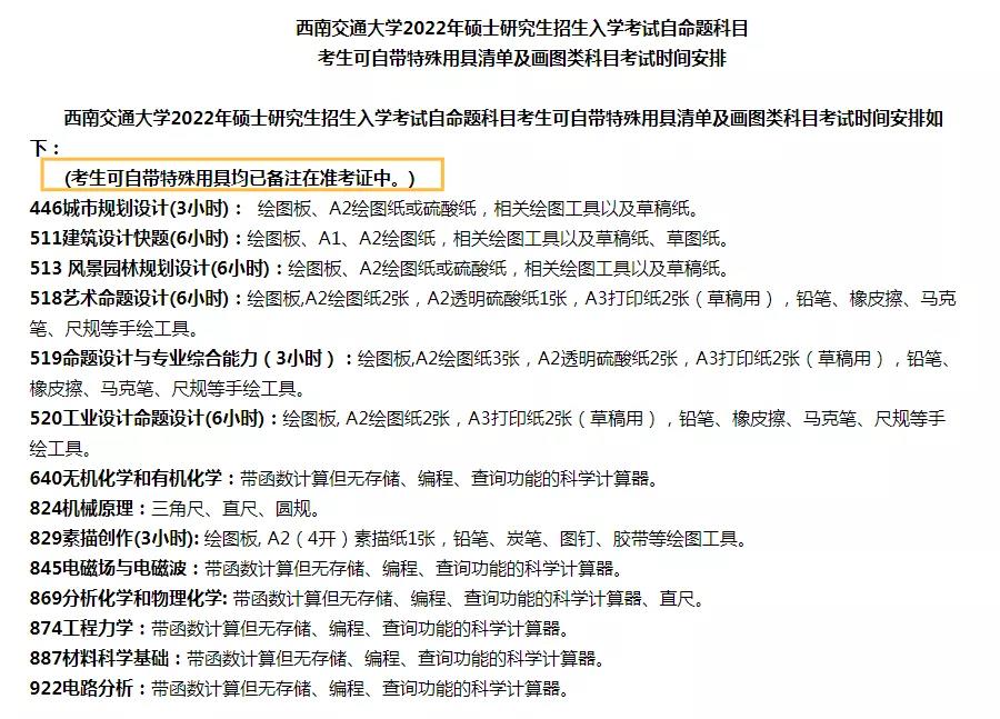 西南交通大學11月19日發(fā)布了《西南交通大學2022年碩士研究生招生入學考試自命題科目,考生可自帶特殊用具清單及畫圖類科目考試時間安排》。