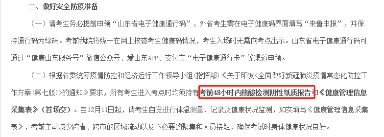 山東省教育招生考試辦發(fā)布的22考研考生須知中明確了“所有考生進(jìn)入考點(diǎn)時(shí)均須持有考前48小時(shí)內(nèi)核酸檢測(cè)陰性紙質(zhì)報(bào)告和《健康管理信息采集表》(首場(chǎng)交)”。