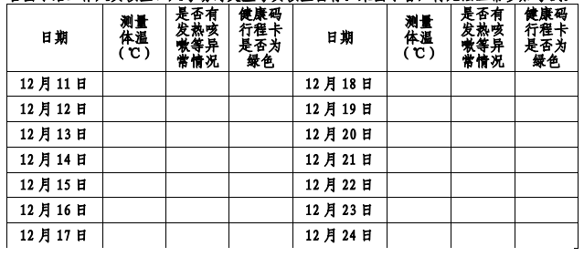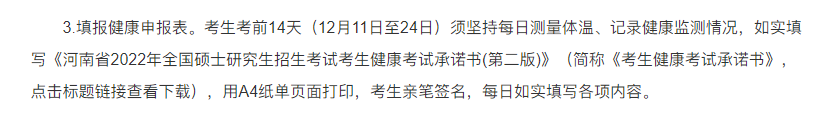 考生考前14天(12月11日至24日)須堅(jiān)持每日測(cè)量體溫、記錄健康監(jiān)測(cè)情況,如實(shí)填寫《河南省2022年全國(guó)碩士研究生招生考試考生健康考試承諾書(第二版)》(簡(jiǎn)稱《考生健康考試承諾書》,點(diǎn)擊標(biāo)題鏈接查看下載),用A4紙單頁(yè)面打印,考生親筆簽名,每日如實(shí)填寫各項(xiàng)內(nèi)容。