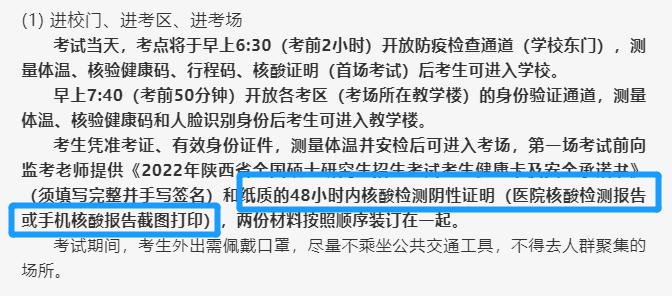 考生憑準(zhǔn)考證、有效身份證件,測(cè)量體溫并安檢后可進(jìn)入考場(chǎng),第一場(chǎng)考試前向監(jiān)考老師提供《2022年陜西省全國(guó)碩士研究生招生考試考生健康卡及安全承諾書》(須填寫完整并手寫簽名)和紙質(zhì)的48小時(shí)內(nèi)核酸檢測(cè)陰性證明(醫(yī)院核酸檢測(cè)報(bào)告或手機(jī)核酸報(bào)告截圖打印),兩份材料按照順序裝訂在一起。