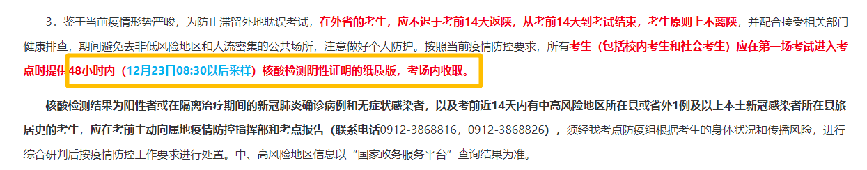 所有考生(包括校內(nèi)考生和社會(huì)考生)應(yīng)在第一場(chǎng)考試進(jìn)入考點(diǎn)時(shí)提供48小時(shí)內(nèi)(12月23日08:30以后采樣)核酸檢測(cè)陰性證明的紙質(zhì)版,考場(chǎng)內(nèi)收取。所以小伙伴一定要提前準(zhǔn)備好,以防進(jìn)不去考場(chǎng)。