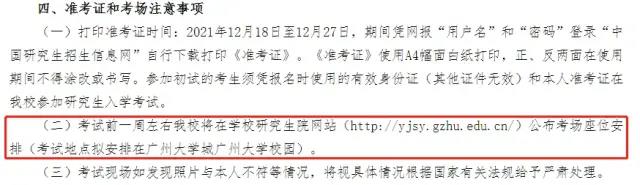 考試前一周左右我校將在學(xué)校研究生院網(wǎng)站(http://yjsy.gzhu.edu.cn/)公布考場(chǎng)座位安排(考試地點(diǎn)擬安排在廣州大學(xué)城廣州大學(xué)校園)。