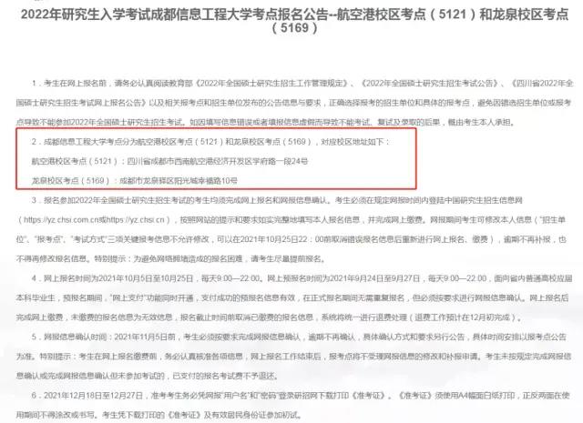 成都信息工程大學(xué)考點(diǎn)分為航空港校區(qū)考點(diǎn)(5121)和龍泉校區(qū)考點(diǎn)(5169),對(duì)應(yīng)校區(qū)地址如下: