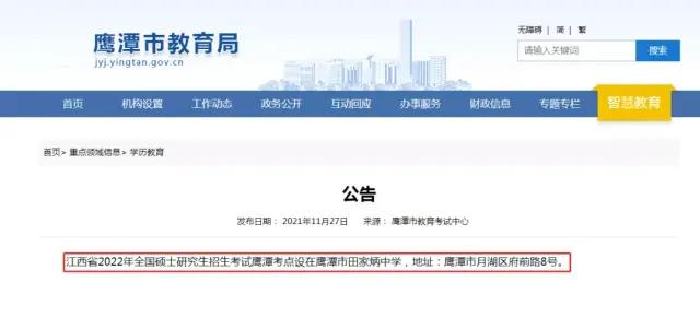 江西省2022年全國(guó)碩士研究生招生考試鷹潭考點(diǎn)設(shè)在鷹潭市田家炳中學(xué),地址:鷹潭市月湖區(qū)府前路8號(hào)。