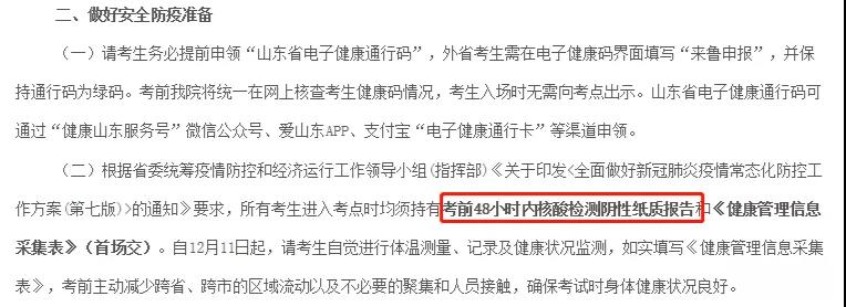 山東省教育招生考試辦發(fā)布的22考研考生須知中明確了“所有考生進入考點時均須持有考前48小時內(nèi)核酸檢測陰性紙質(zhì)報告和《健康管理信息采集表》(首場交)”。