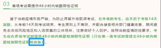 考生應在參加考試時提供48小時內(nèi)核酸檢測陰性證明(只在第一場考試時需提交48小時內(nèi)核酸檢測陰性證明紙質(zhì)版)。