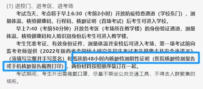 考生憑準考證、有效身份證件,測量體溫并安檢后可進入考場,第一場考試前向監(jiān)考老師提供《2022年陜西省全國碩士研究生招生考試考生健康卡及安全承諾書》(須填寫完整并手寫簽名)和紙質(zhì)的48小時內(nèi)核酸檢測陰性證明(醫(yī)院核酸檢測報告或手機核酸報告截圖打?。?,兩份材料按照順序裝訂在一起。