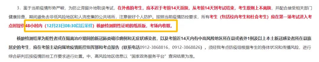 所有考生(包括校內(nèi)考生和社會考生)應在第一場考試進入考點時提供48小時內(nèi)(12月23日08:30以后采樣)核酸檢測陰性證明的紙質(zhì)版,考場內(nèi)收取。