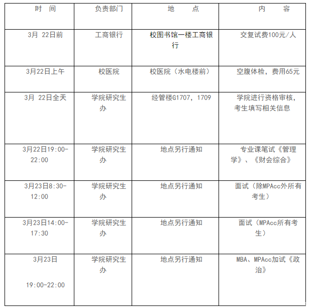3、加試:MBA、MPAcc的所有復試考生加試《政治》,滿分100分,閉卷考試,考試時間為3小時。專業(yè)課筆試成績、加試成績各占筆試成績60%和40%。