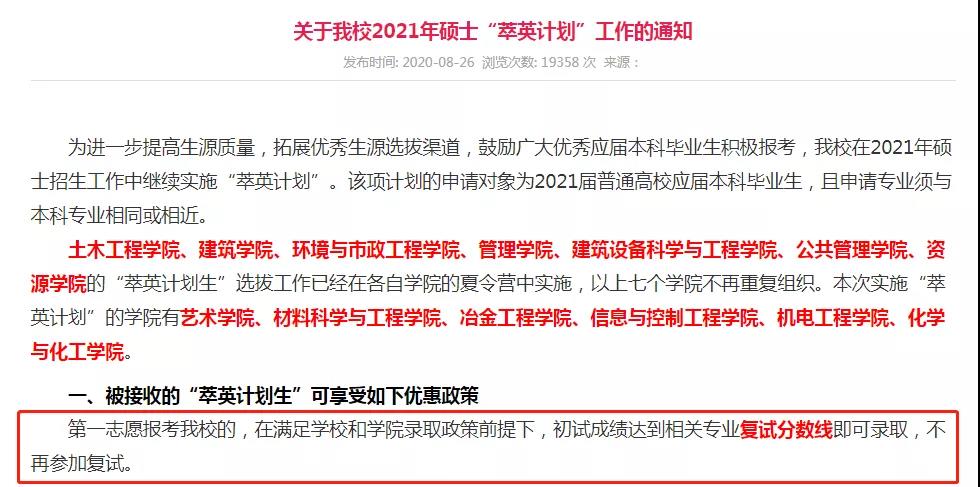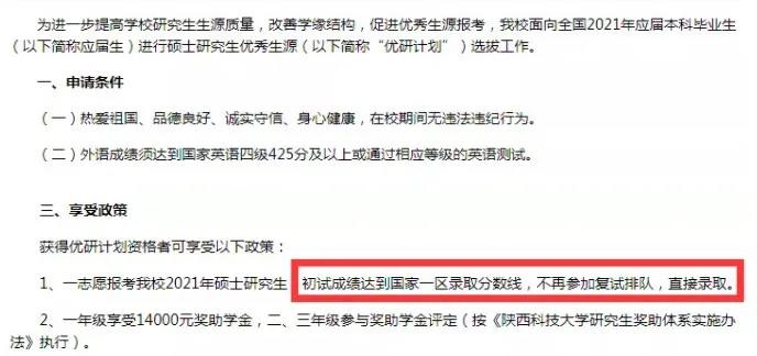 西安建筑科技大學(xué)的“萃英計劃”主要是面對普通高校應(yīng)屆本科畢業(yè)生,一旦具有選拔資格,在一志愿報考后,初試成績達到專業(yè)復(fù)試分數(shù)線,就不用參加復(fù)試,直接擬錄取了。 不過既然是人才選拔,要求也比較嚴苛,比如應(yīng)屆生要具有推免資格,或者要有特長,比如一定規(guī)格競賽成績或論文成果。 西安理工大學(xué)每年7-9月會對報考學(xué)校當年碩士研究生的校內(nèi)外應(yīng)屆本科畢業(yè)生進行預(yù)選拔暨創(chuàng)新能力認定。 如果獲得了創(chuàng)新能力認定證書,一志愿報考西安理工大學(xué),初試過了國家A區(qū)線后,可直接優(yōu)先錄取,甚至都不受學(xué)校自劃線的限制哦!