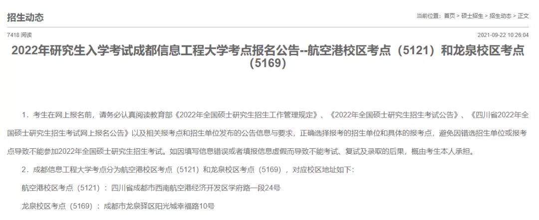 成都信息工程大學考點分為航空港校區(qū)考點(5121)和龍泉校區(qū)考點(5169),對應校區(qū)地址如下: