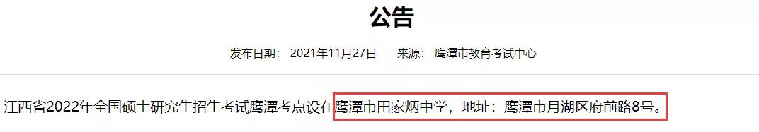 江西省2022年全國碩士研究生招生考試鷹潭考點設在鷹潭市田家炳中學,地址:鷹潭市月湖區(qū)府前路8號。