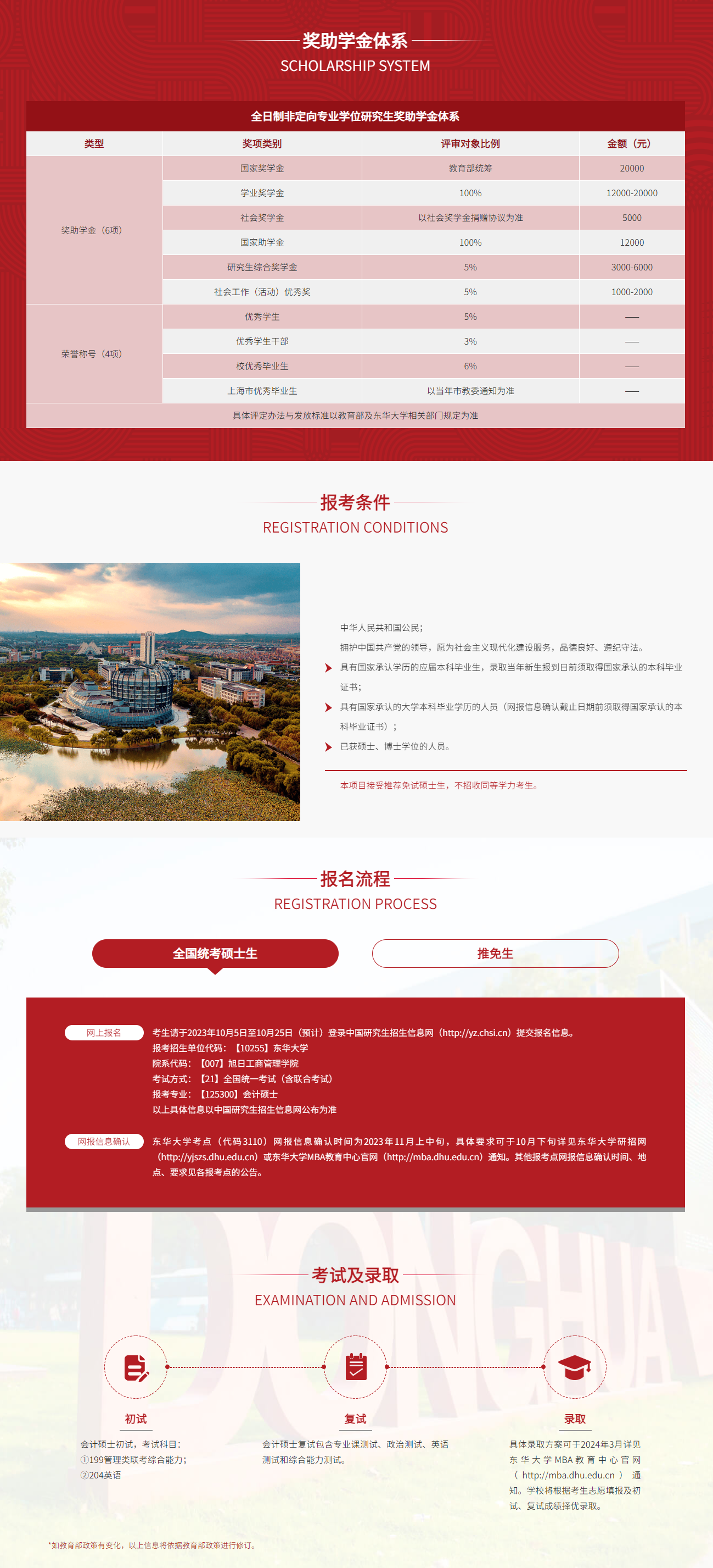 導讀:招生簡章是每年考研er需要關(guān)注的重要官方政策,一般情況下涵蓋了各個專業(yè)的報考條件、招生名額、學費、學制、報考流程等必要信息,為了幫助大家及時掌握一手信息,迅速做出報考應對,小編今天為大家?guī)砹恕?024MPAcc招生簡章:東華大學2024年會計碩士(MPAcc)招生簡章”,一起關(guān)注一下吧!