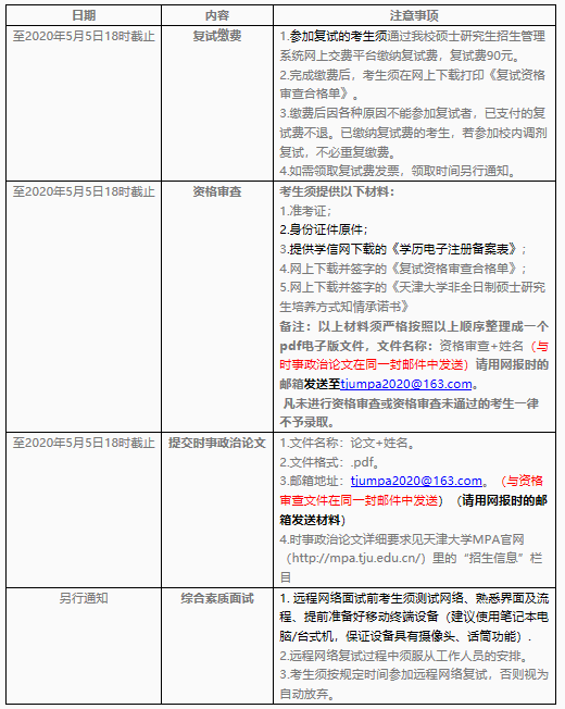 2. 進(jìn)入復(fù)試的考生名單詳見天津大學(xué)MPA官網(wǎng)(http://mpa.tju.edu.cn/)的招生信息欄。