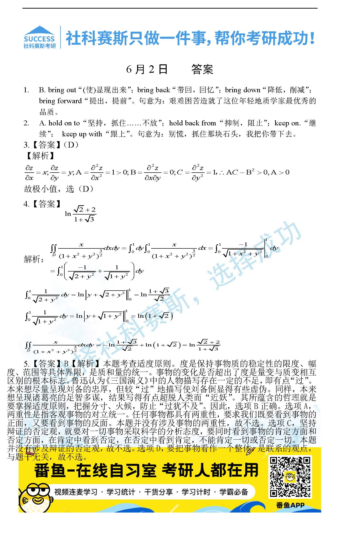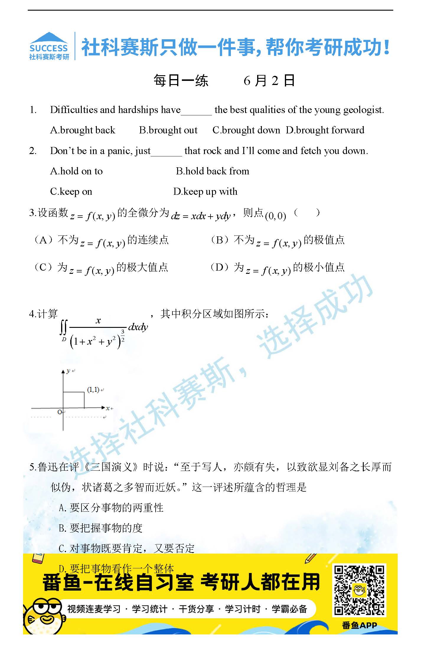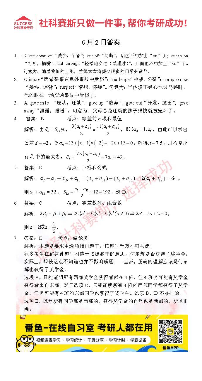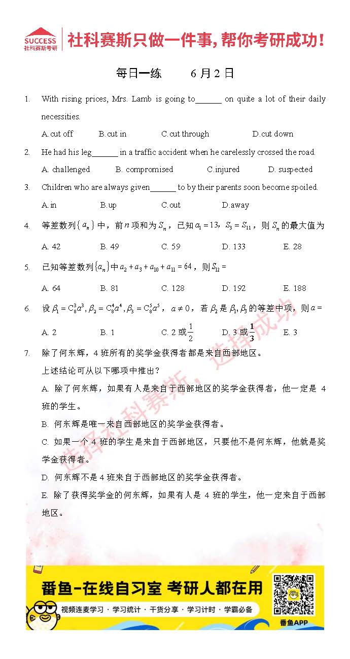 導(dǎo)讀:考研是一場(chǎng)持久戰(zhàn),保持良好的學(xué)習(xí)習(xí)慣,是能確保復(fù)習(xí)高效的關(guān)鍵。今天社科賽斯MBA備考網(wǎng)小編整理了“2022管理類聯(lián)考6月2日每日一練及答案”的內(nèi)容,希望能對(duì)廣大考生有所幫助。