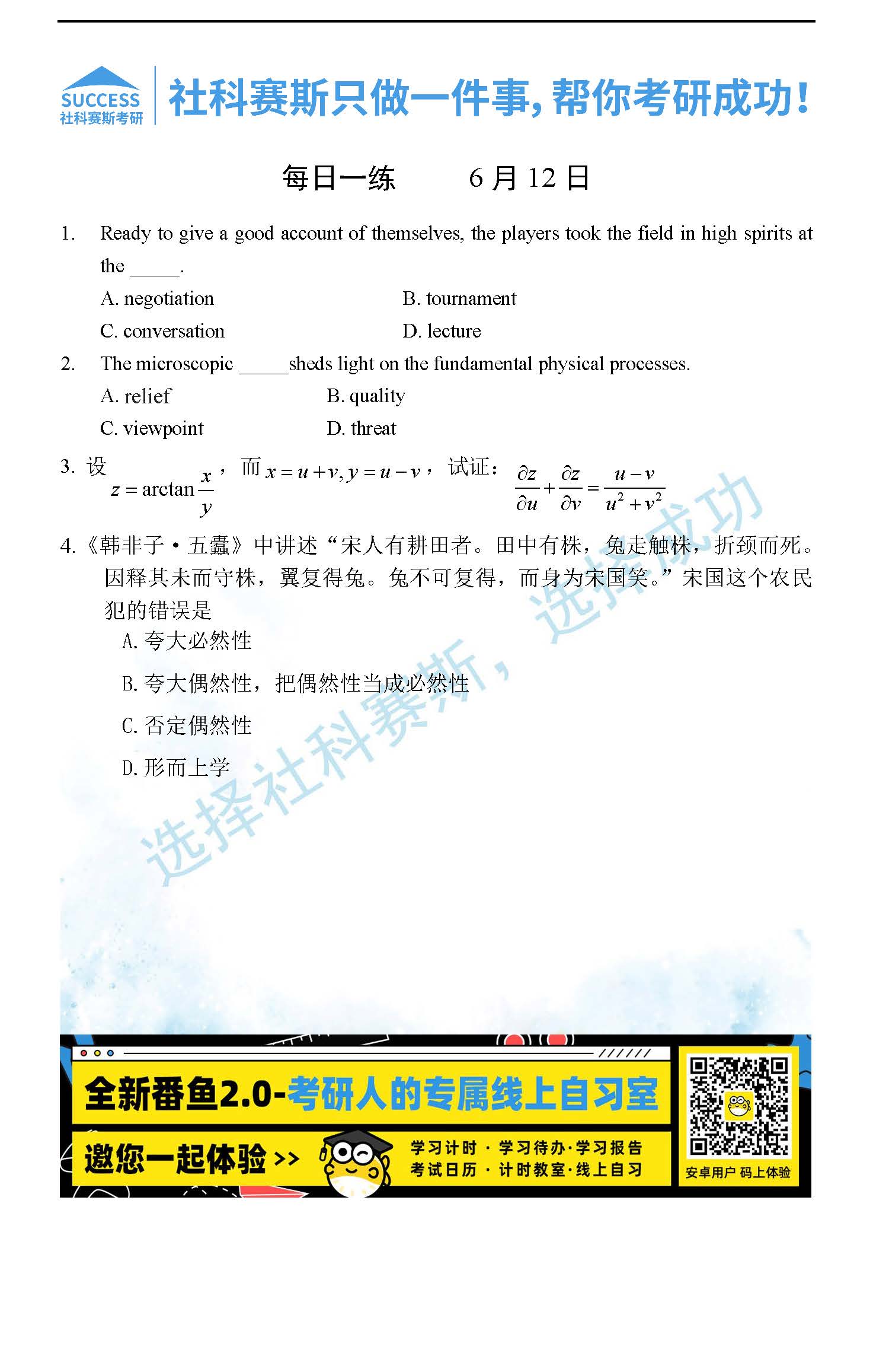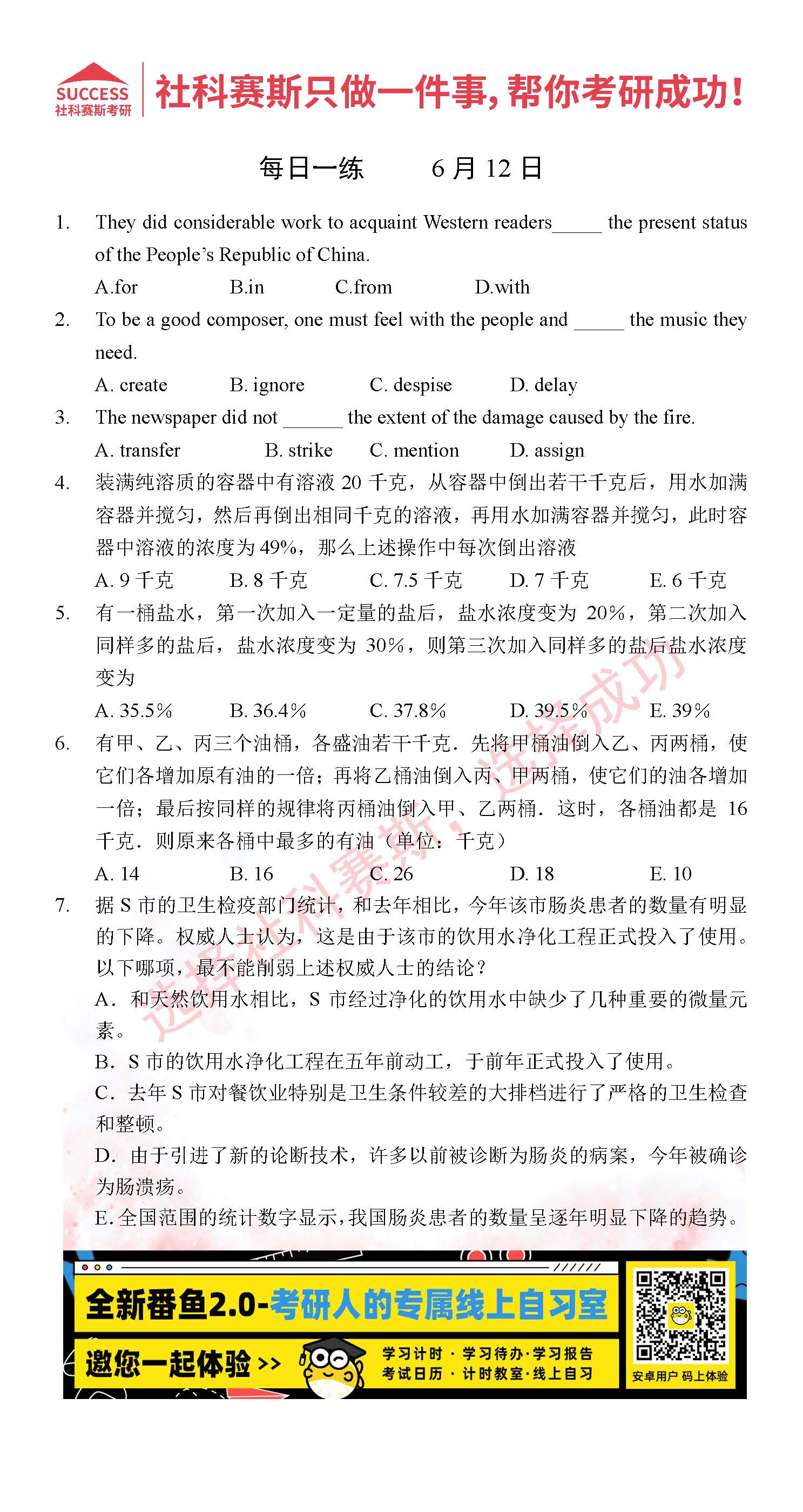 導(dǎo)讀:考研是一場(chǎng)持久戰(zhàn),保持良好的學(xué)習(xí)習(xí)慣,是能確保復(fù)習(xí)高效的關(guān)鍵。今天社科賽斯MBA備考網(wǎng)小編整理了“2022管理類(lèi)聯(lián)考6月12日每日一練及答案”的內(nèi)容,希望能對(duì)廣大考生有所幫助。