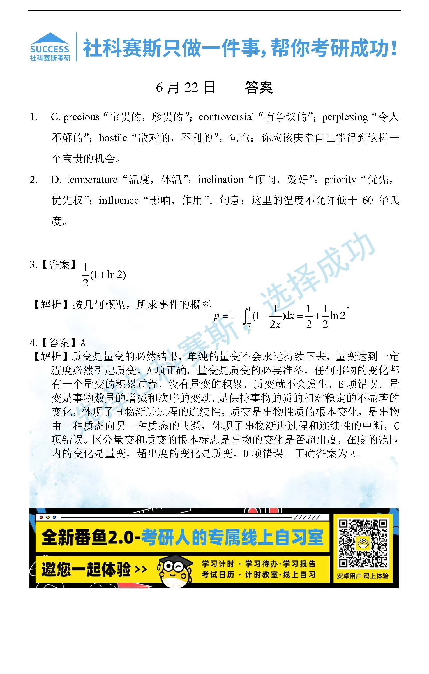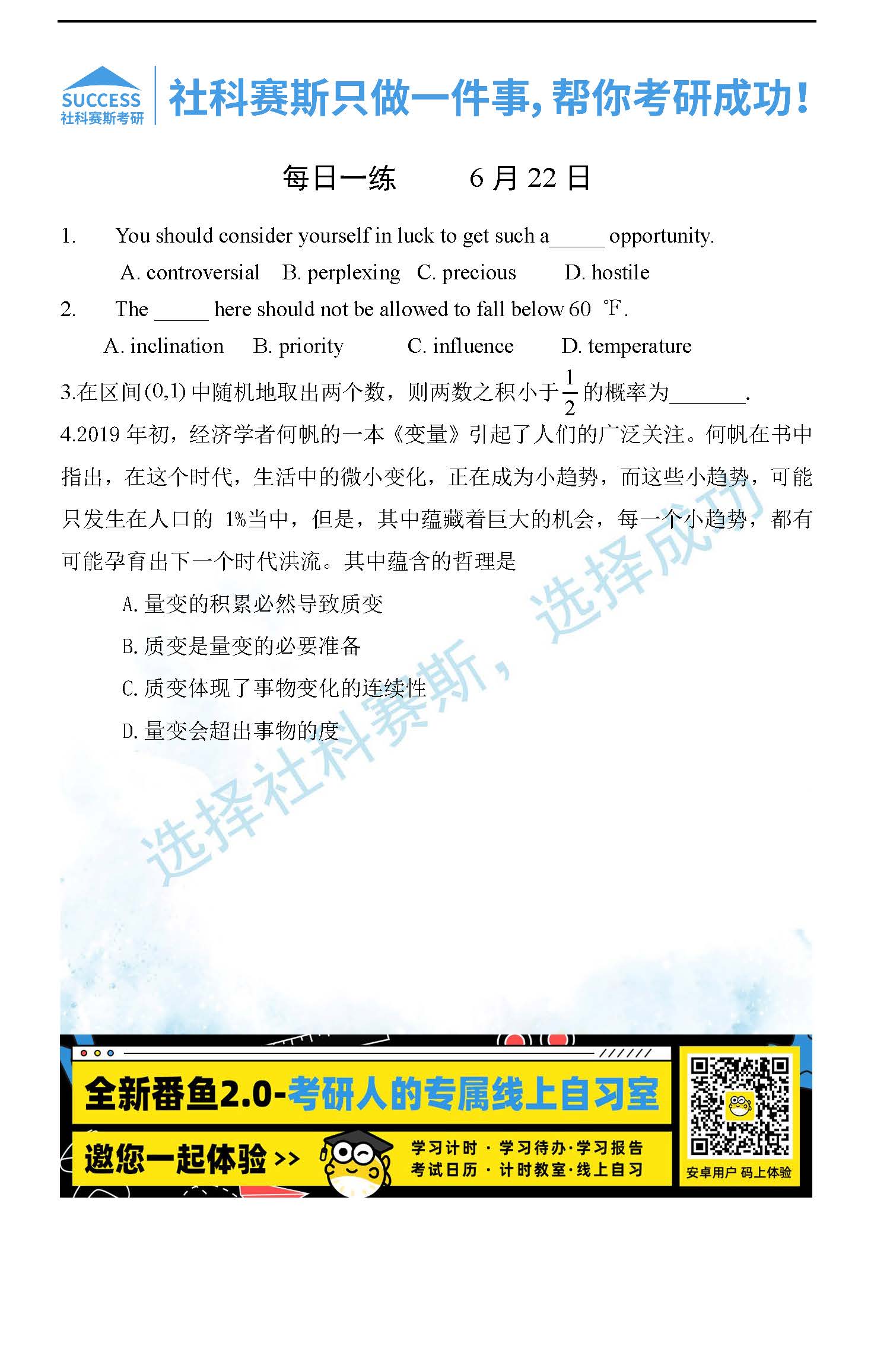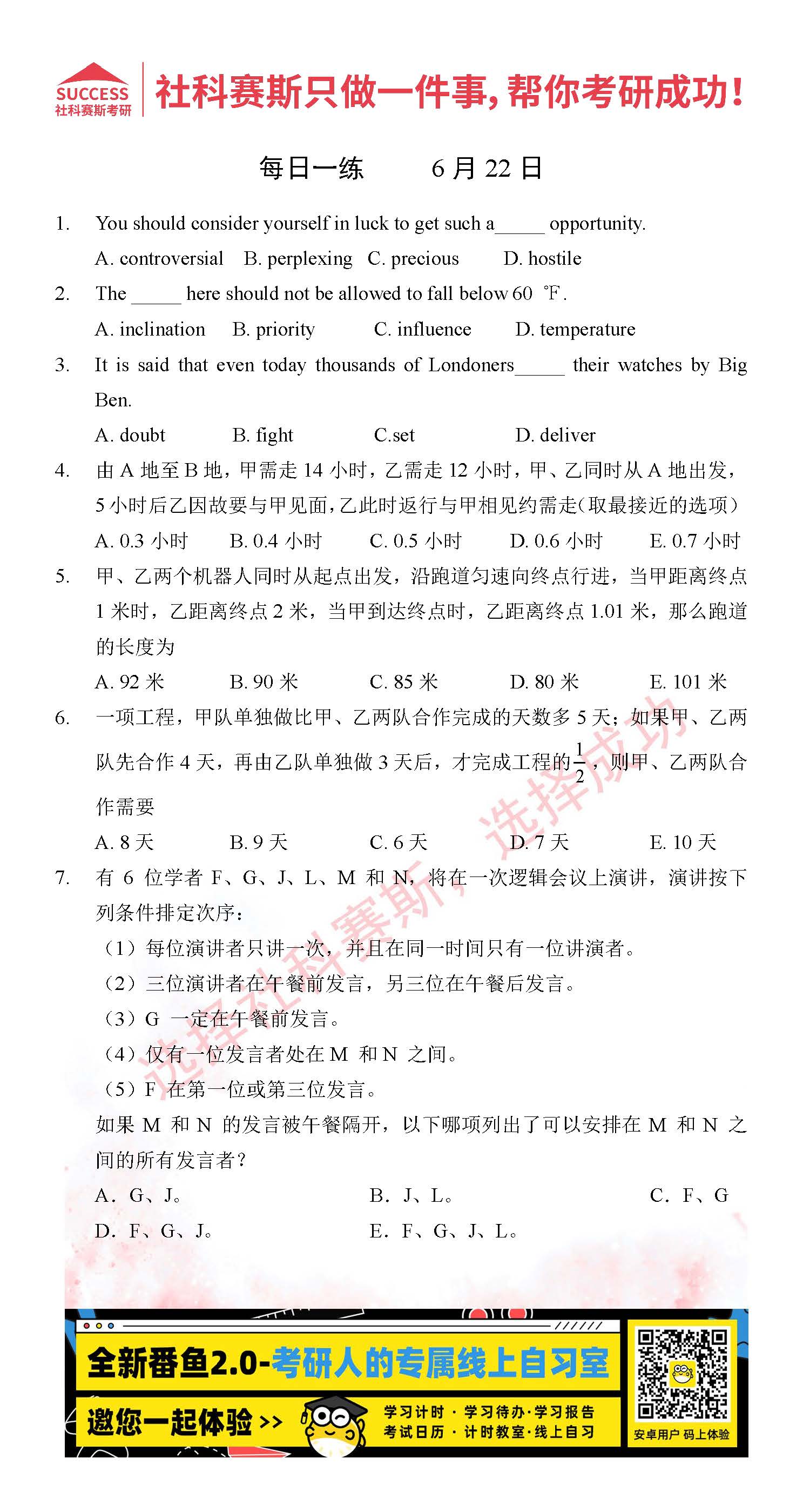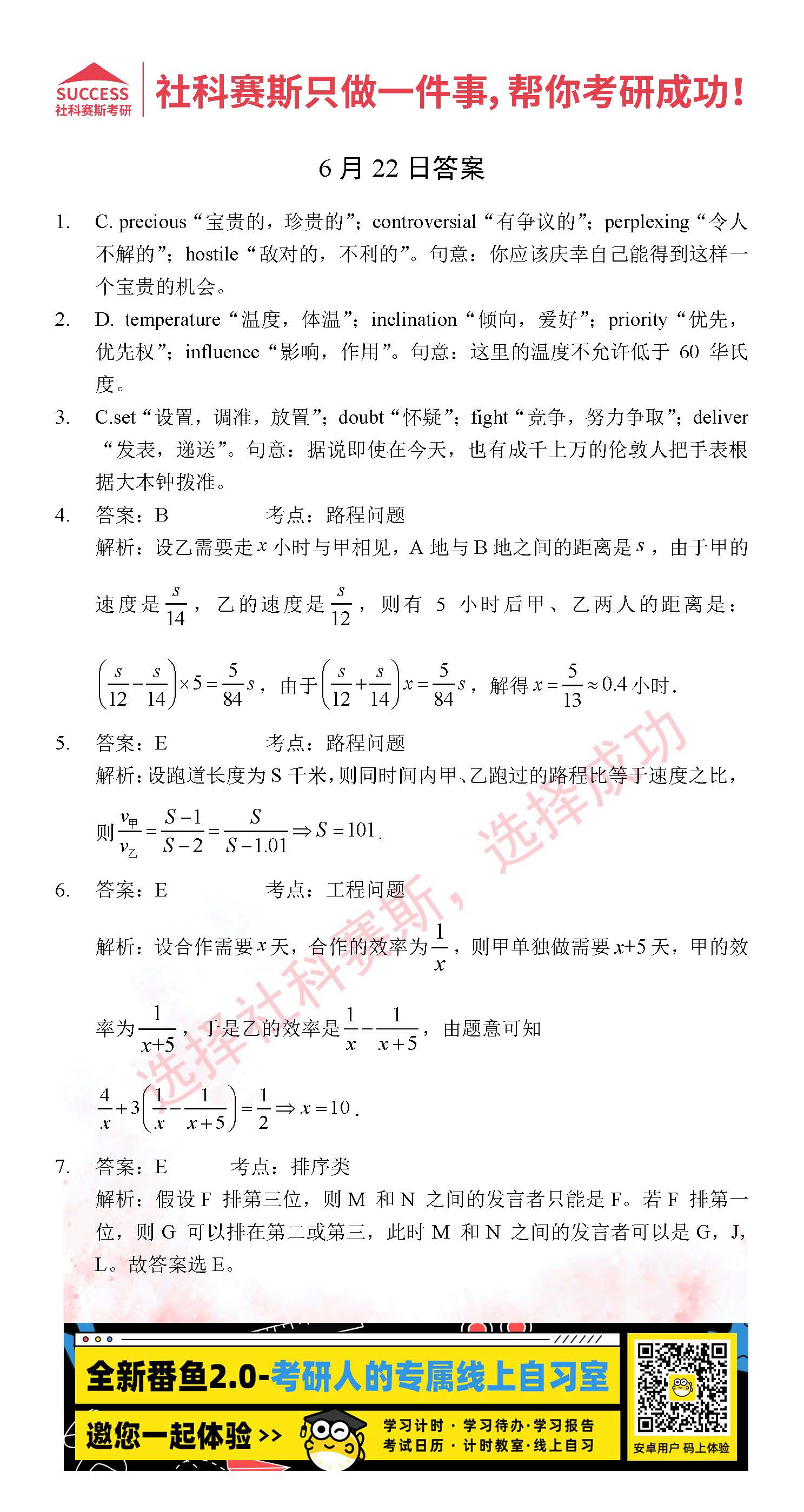 導(dǎo)讀:考研是一場(chǎng)持久戰(zhàn),保持良好的學(xué)習(xí)習(xí)慣,是能確保復(fù)習(xí)高效的關(guān)鍵。今天社科賽斯MBA備考網(wǎng)小編整理了“2022管理類聯(lián)考6月22日每日一練及答案”的內(nèi)容,希望能對(duì)廣大考生有所幫助。