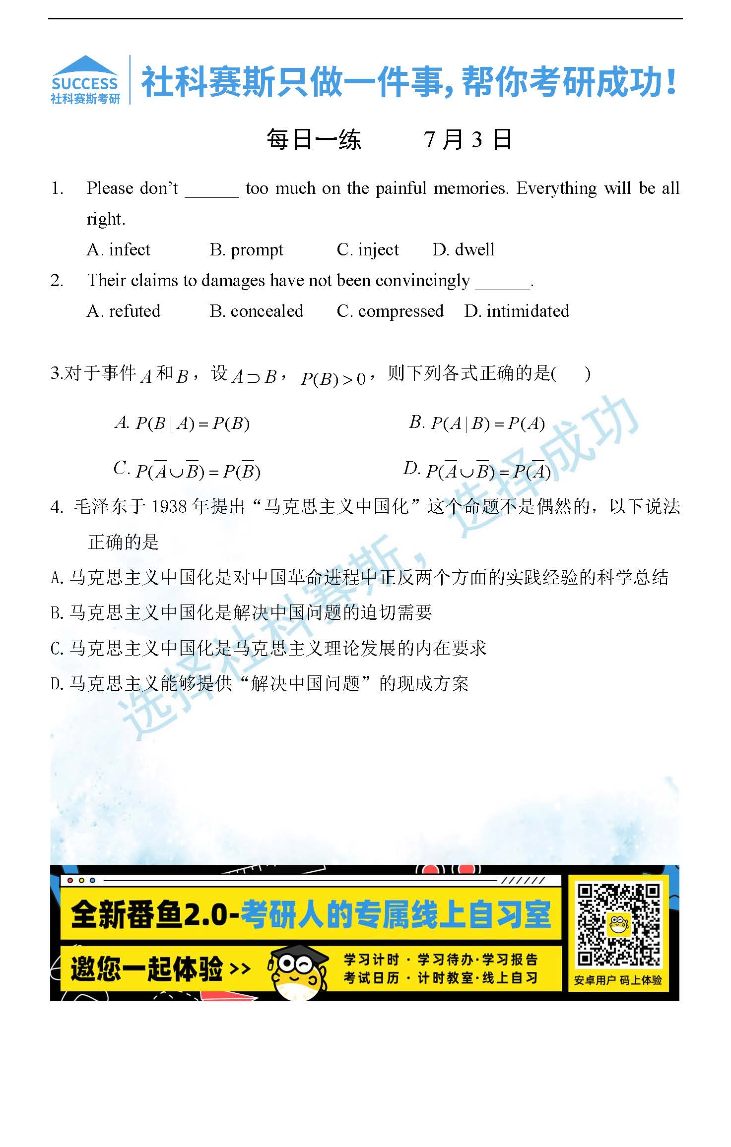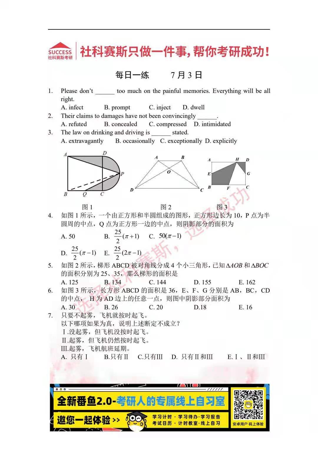 導(dǎo)讀:考研是一場(chǎng)持久戰(zhàn),保持良好的學(xué)習(xí)習(xí)慣,是能確保復(fù)習(xí)高效的關(guān)鍵。今天社科賽斯MBA備考網(wǎng)小編整理了“2022管理類聯(lián)考7月3日每日一練及答案”的內(nèi)容,希望能對(duì)廣大考生有所幫助。