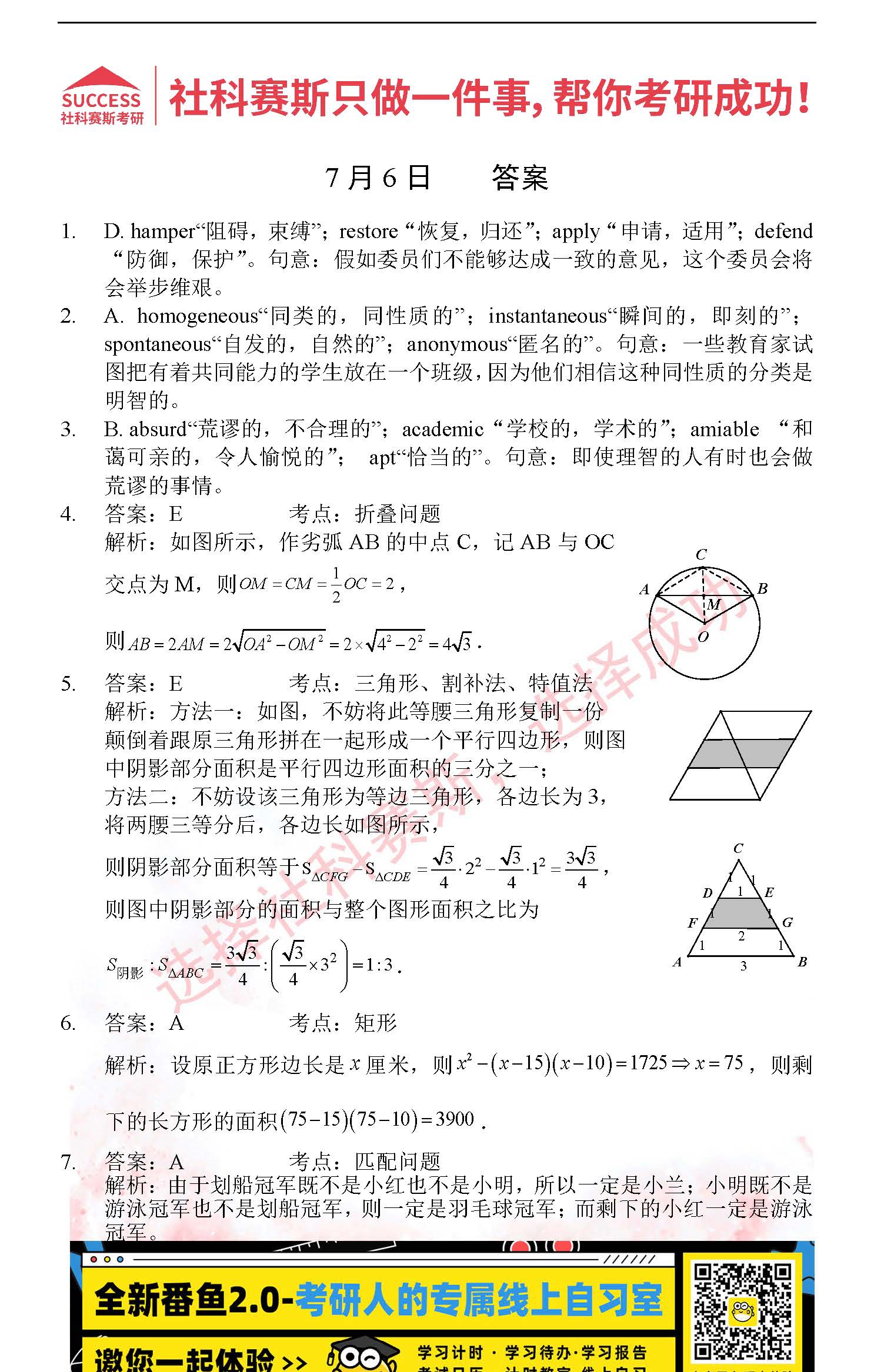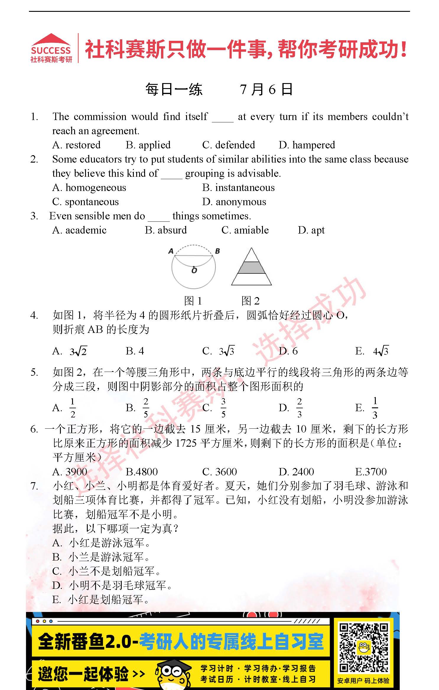 以上就是社科賽斯MBA備考網(wǎng)小編為大家整理“2022管理類聯(lián)考7月6日每日一練及答案”的全部?jī)?nèi)容,希望各位考生堅(jiān)持利用起來(lái),更多每日一練內(nèi)容請(qǐng)持續(xù)關(guān)注MBA備考網(wǎng)管理類聯(lián)考每日一練。