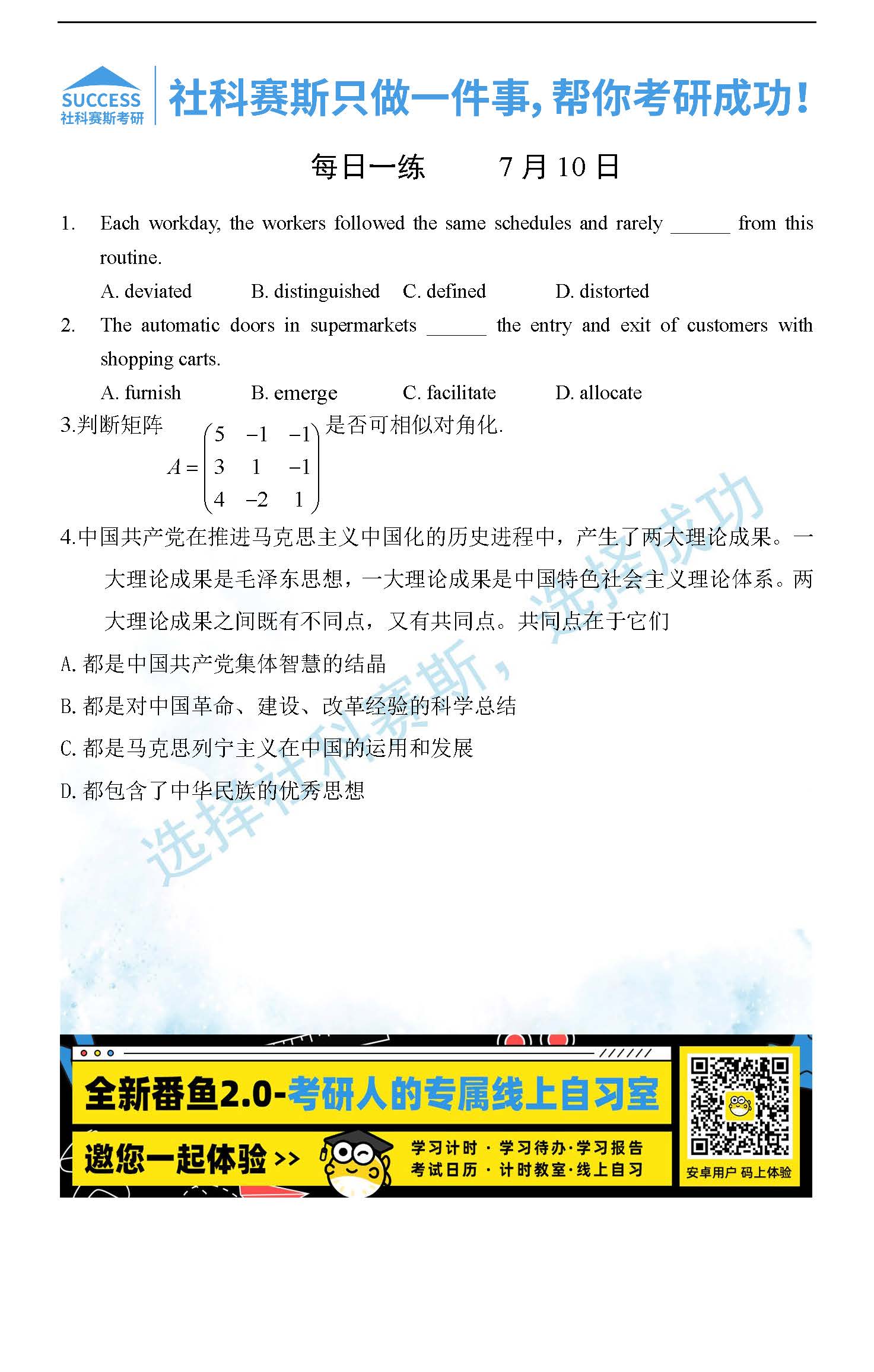 導(dǎo)讀:考研是一場持久戰(zhàn),保持良好的學(xué)習(xí)習(xí)慣,是能確保復(fù)習(xí)高效的關(guān)鍵。今天社科賽斯MBA備考網(wǎng)小編整理了“2022管理類聯(lián)考7月10日每日一練及答案”的內(nèi)容,希望能對廣大考生有所幫助。