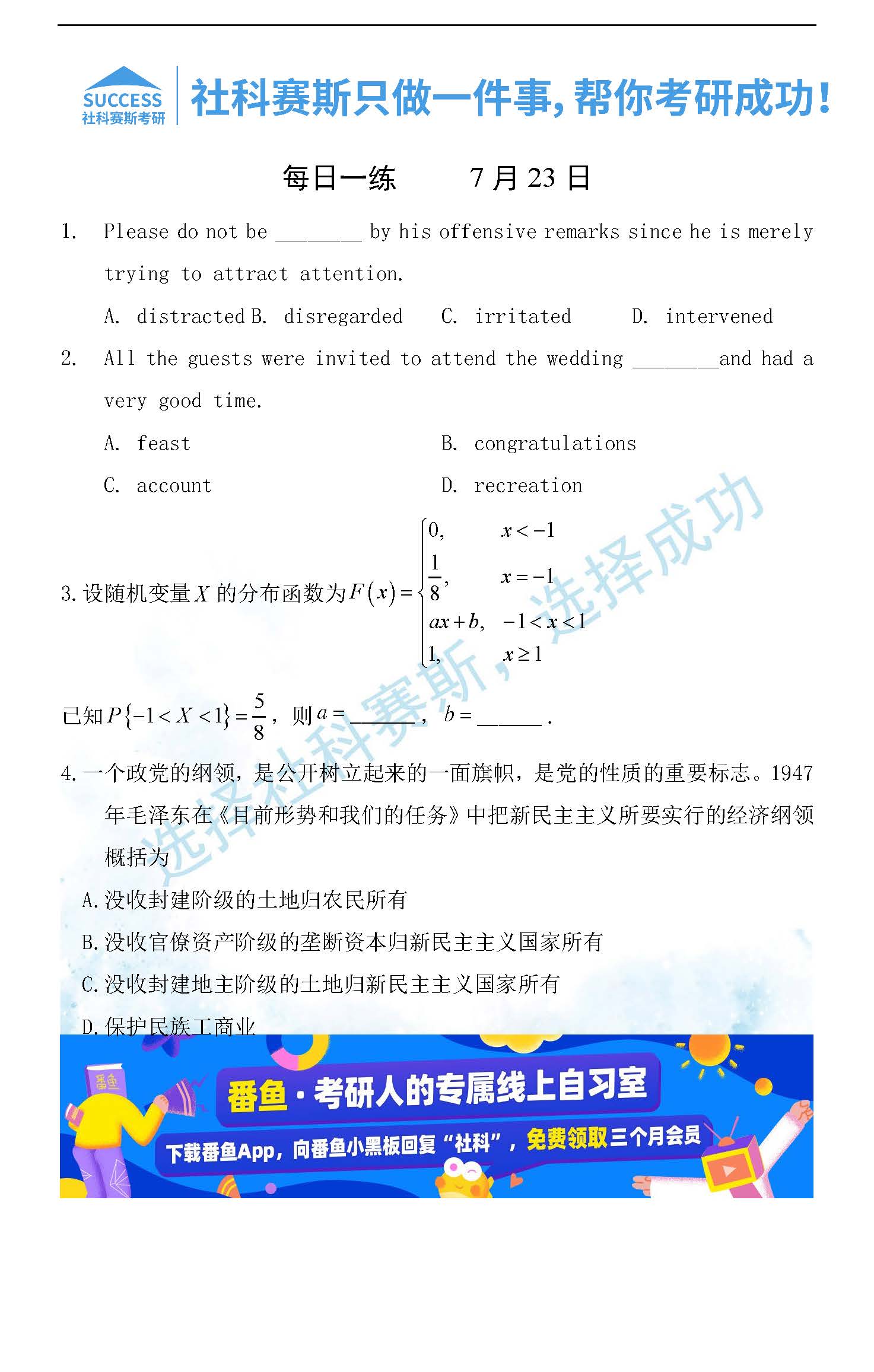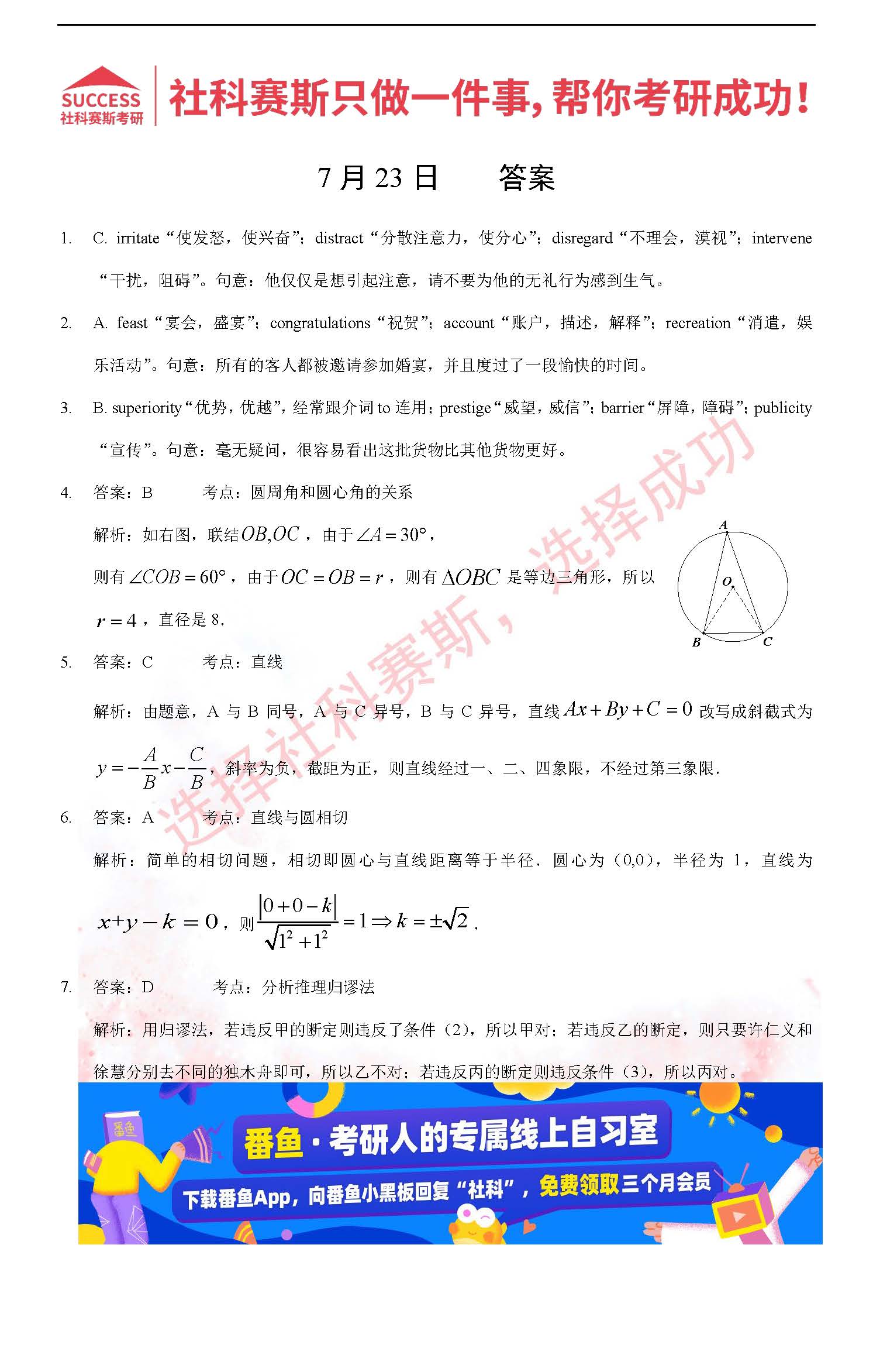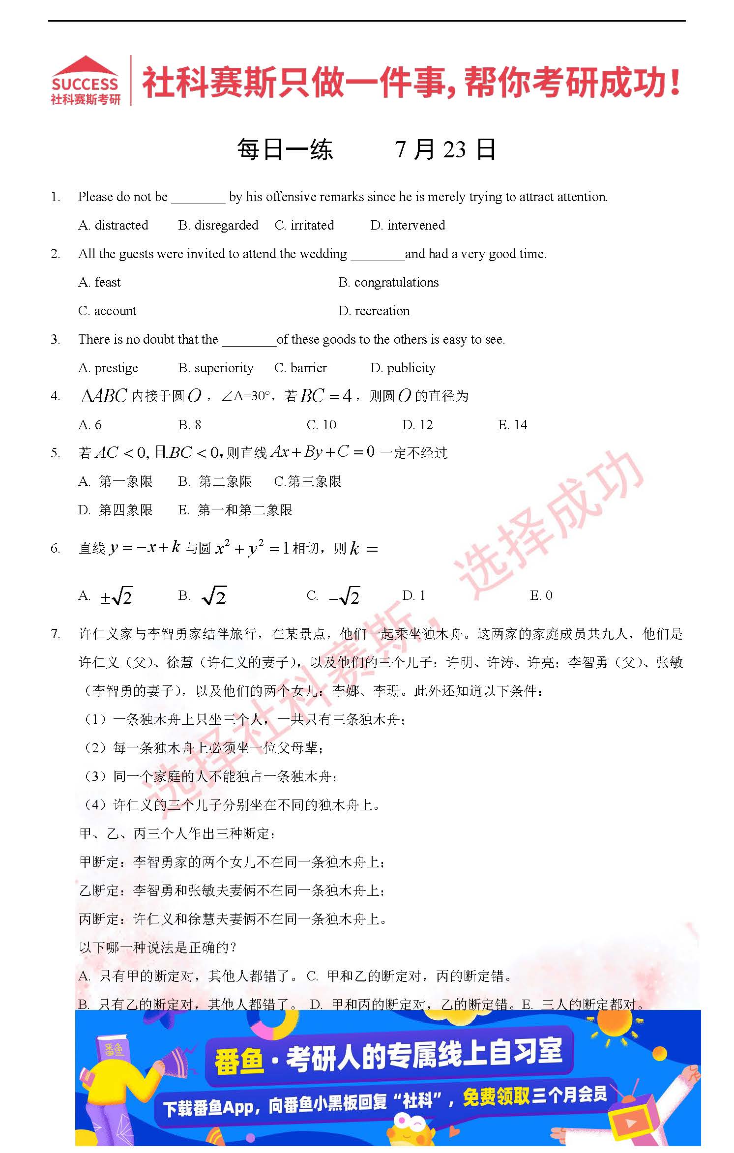導(dǎo)讀:考研是一場(chǎng)持久戰(zhàn),保持良好的學(xué)習(xí)習(xí)慣,是能確保復(fù)習(xí)高效的關(guān)鍵。今天社科賽斯MBA備考網(wǎng)小編整理了“2022管理類聯(lián)考7月23日每日一練及答案”的內(nèi)容,希望能對(duì)廣大考生有所幫助。