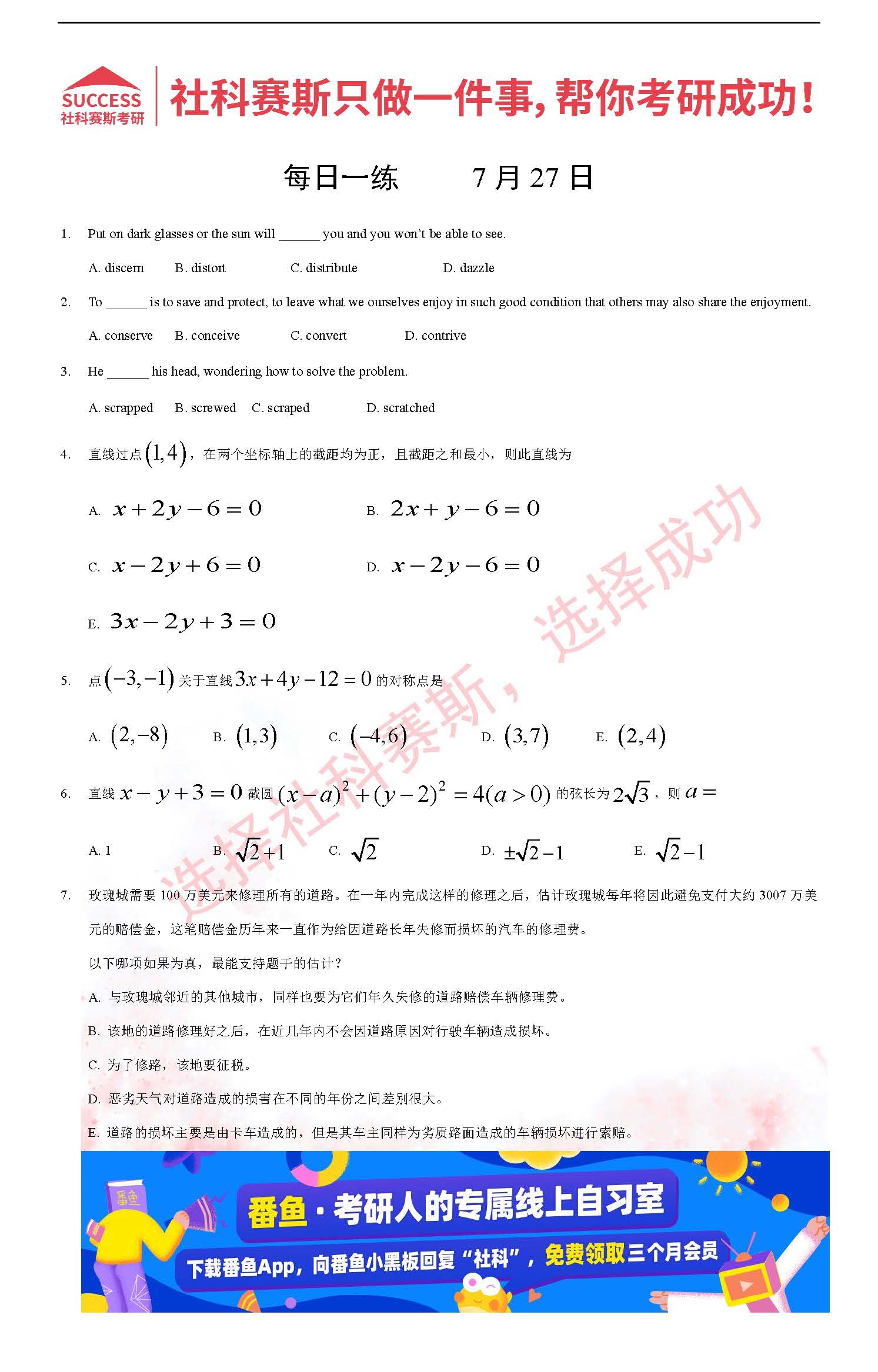 導讀:考研是一場持久戰(zhàn),保持良好的學習習慣,是能確保復習高效的關(guān)鍵。今天社科賽斯MBA備考網(wǎng)小編整理了“2022管理類聯(lián)考7月27日每日一練及答案”的內(nèi)容,希望能對廣大考生有所幫助。