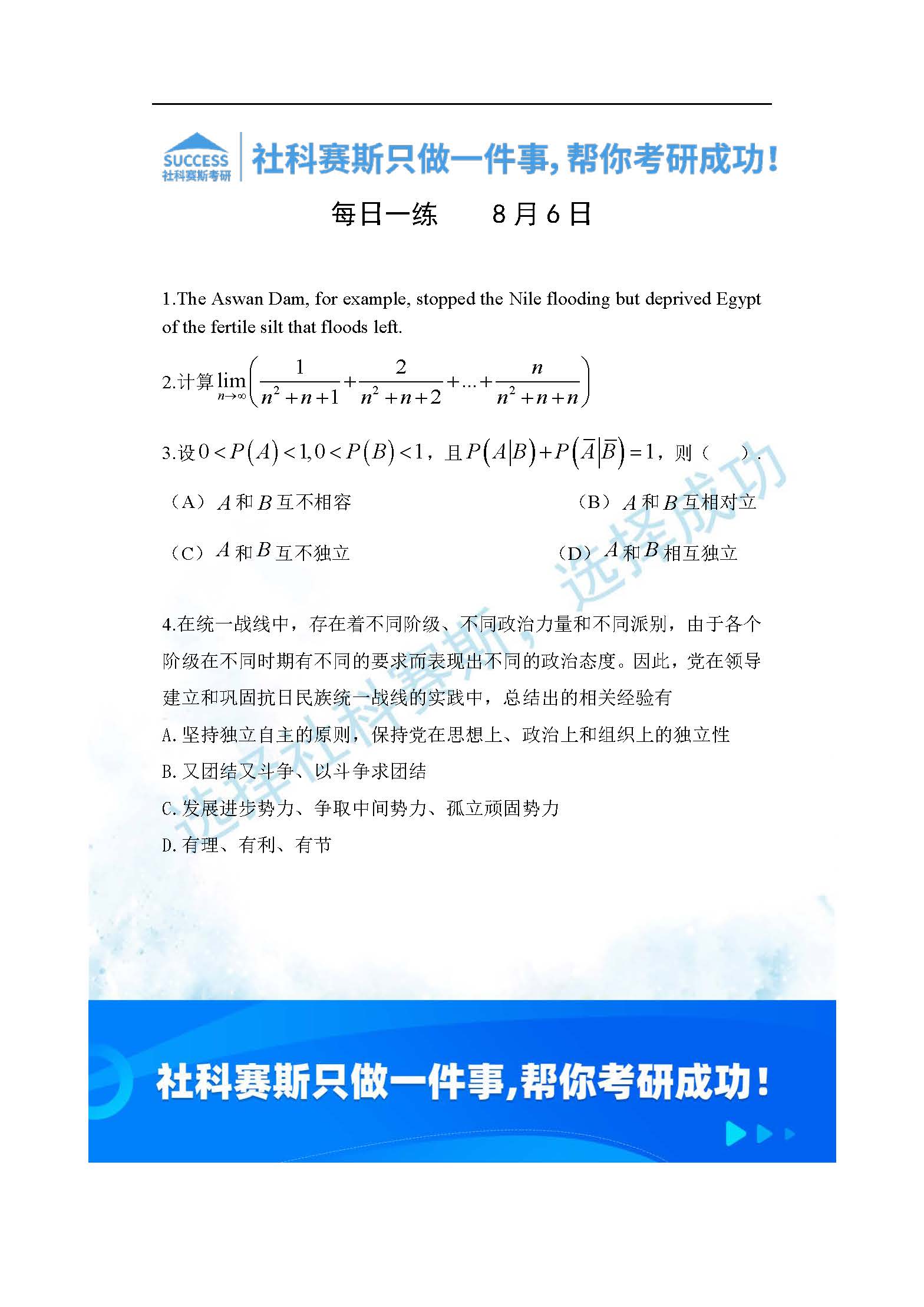 導(dǎo)讀:考研是一場持久戰(zhàn),保持良好的學(xué)習(xí)習(xí)慣,是能確保復(fù)習(xí)高效的關(guān)鍵。今天社科賽斯MBA備考網(wǎng)小編整理了“2022管理類聯(lián)考8月6日每日一練及答案”的內(nèi)容,希望能對廣大考生有所幫助。