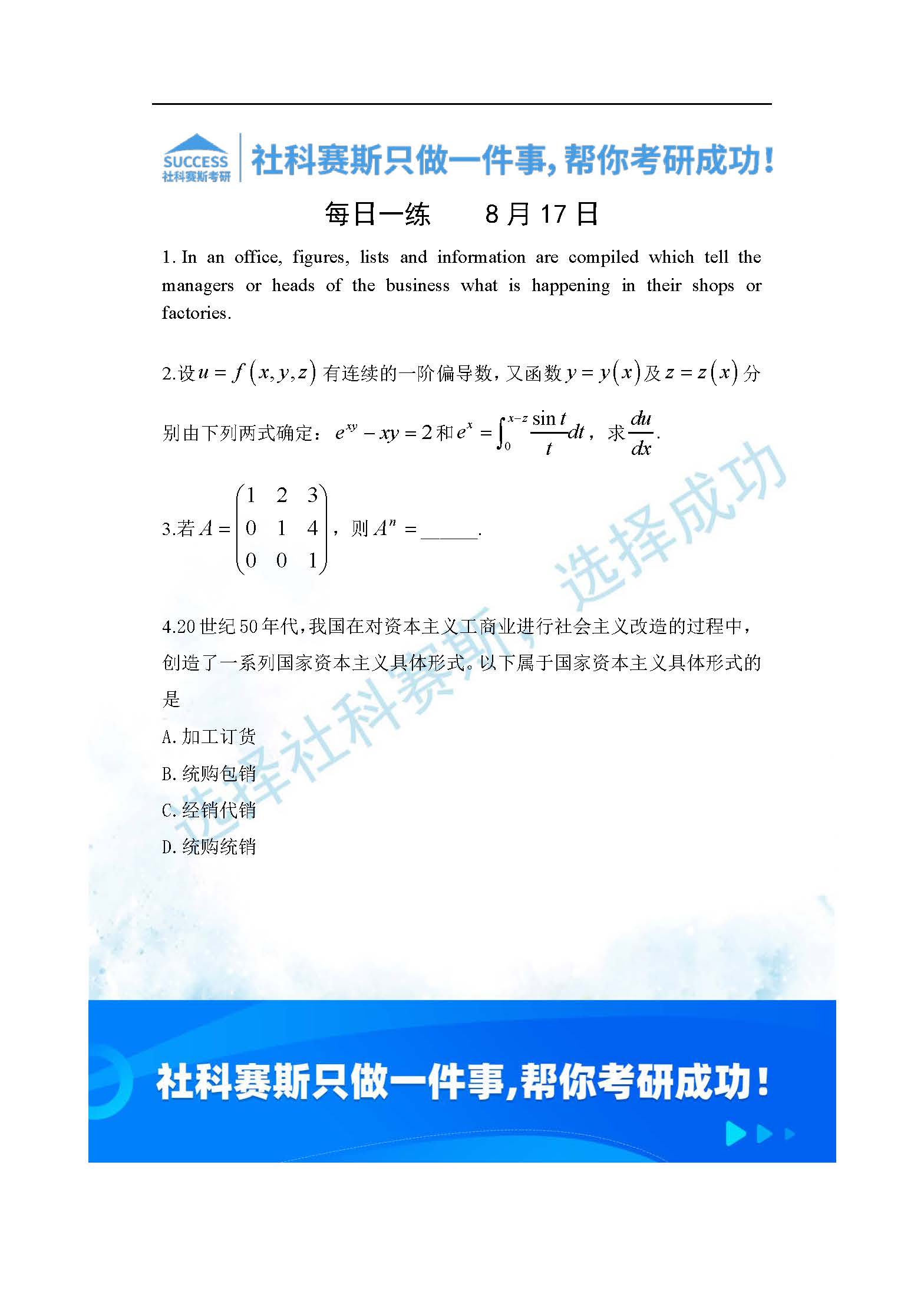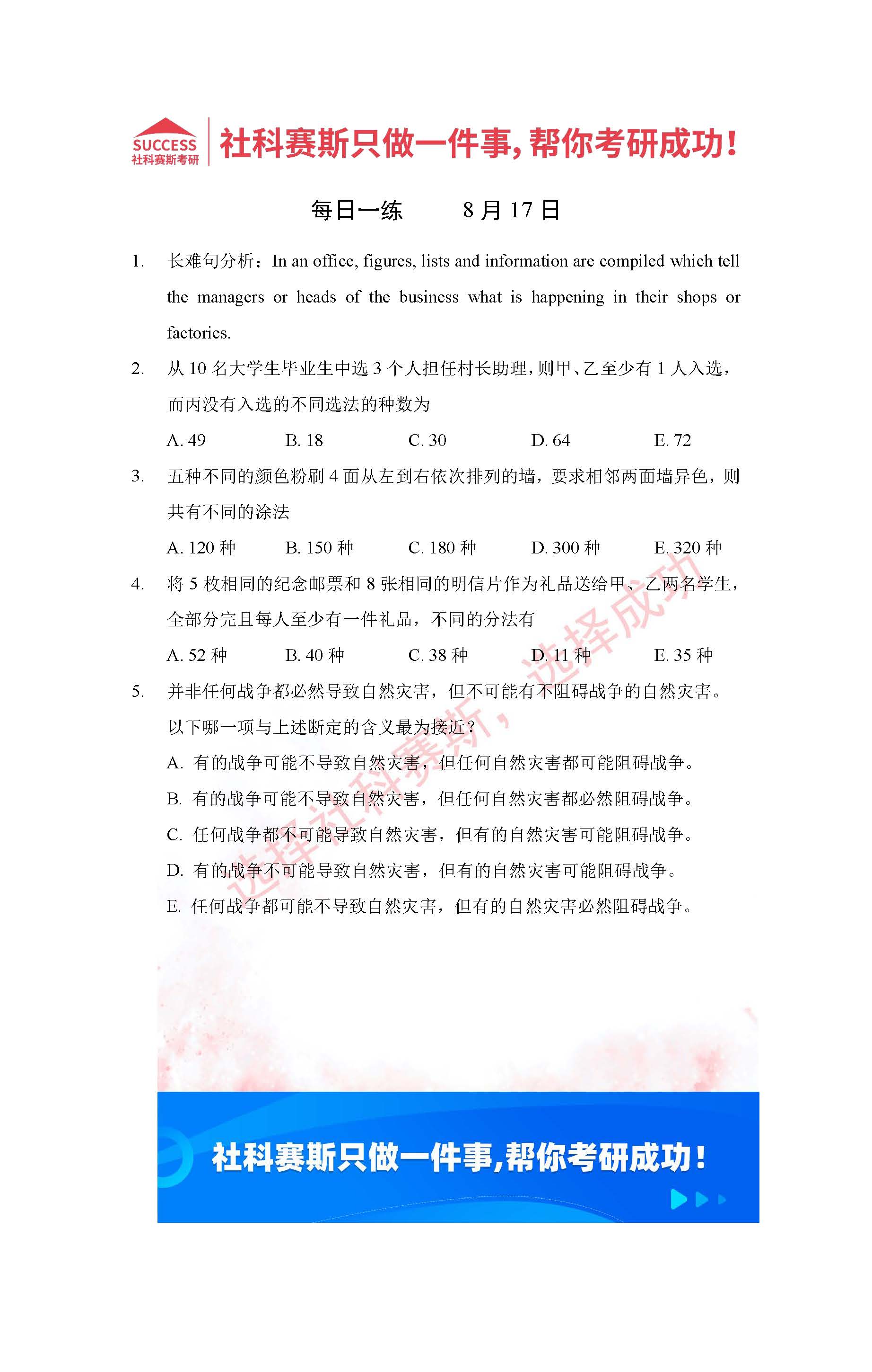 導(dǎo)讀:考研是一場(chǎng)持久戰(zhàn),保持良好的學(xué)習(xí)習(xí)慣,是能確保復(fù)習(xí)高效的關(guān)鍵。今天社科賽斯MBA備考網(wǎng)小編整理了“2022管理類聯(lián)考8月17日每日一練及答案”的內(nèi)容,希望能對(duì)廣大考生有所幫助。