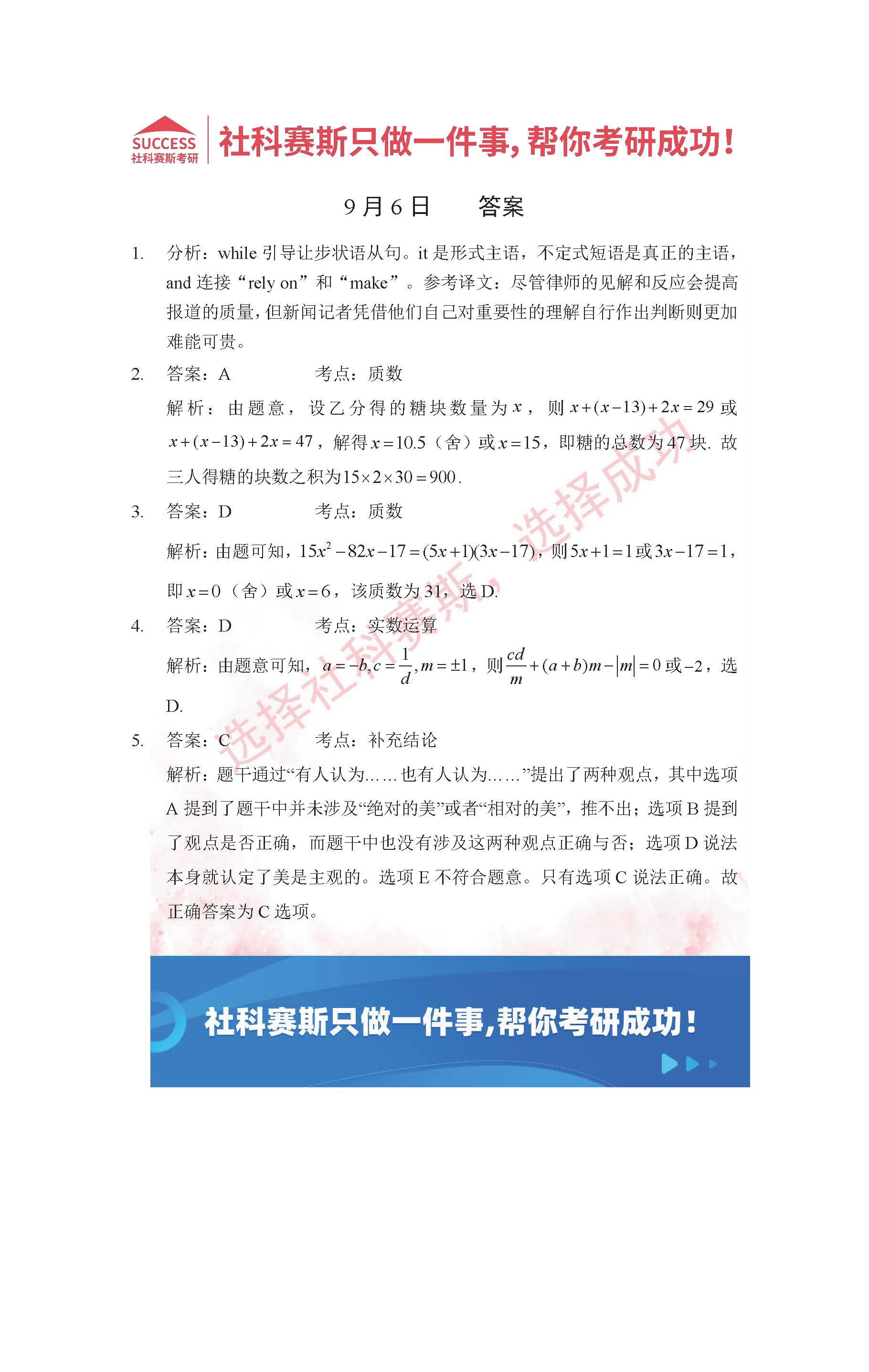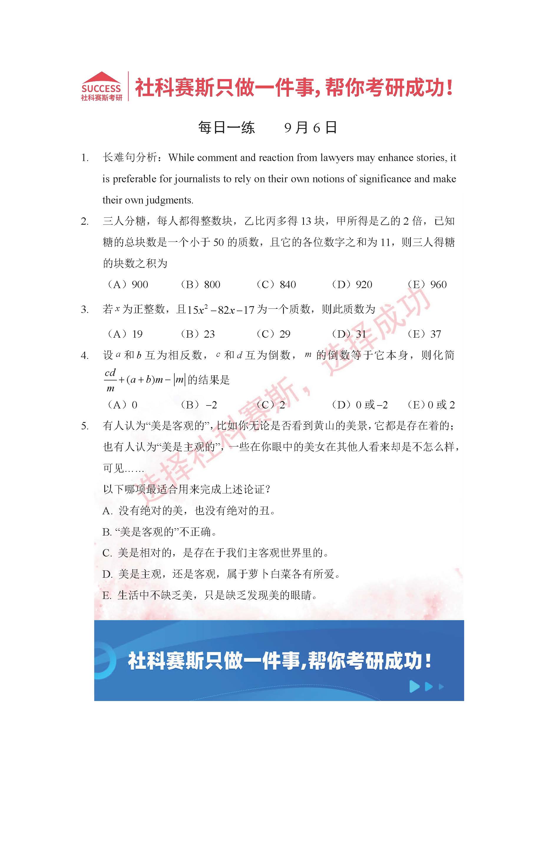 導(dǎo)讀:考研是一場持久戰(zhàn),保持良好的學(xué)習(xí)習(xí)慣,是能確保復(fù)習(xí)高效的關(guān)鍵。今天社科賽斯MBA備考網(wǎng)小編整理了“2022管理類聯(lián)考9月6日每日一練及答案”的內(nèi)容,希望能對廣大考生有所幫助。