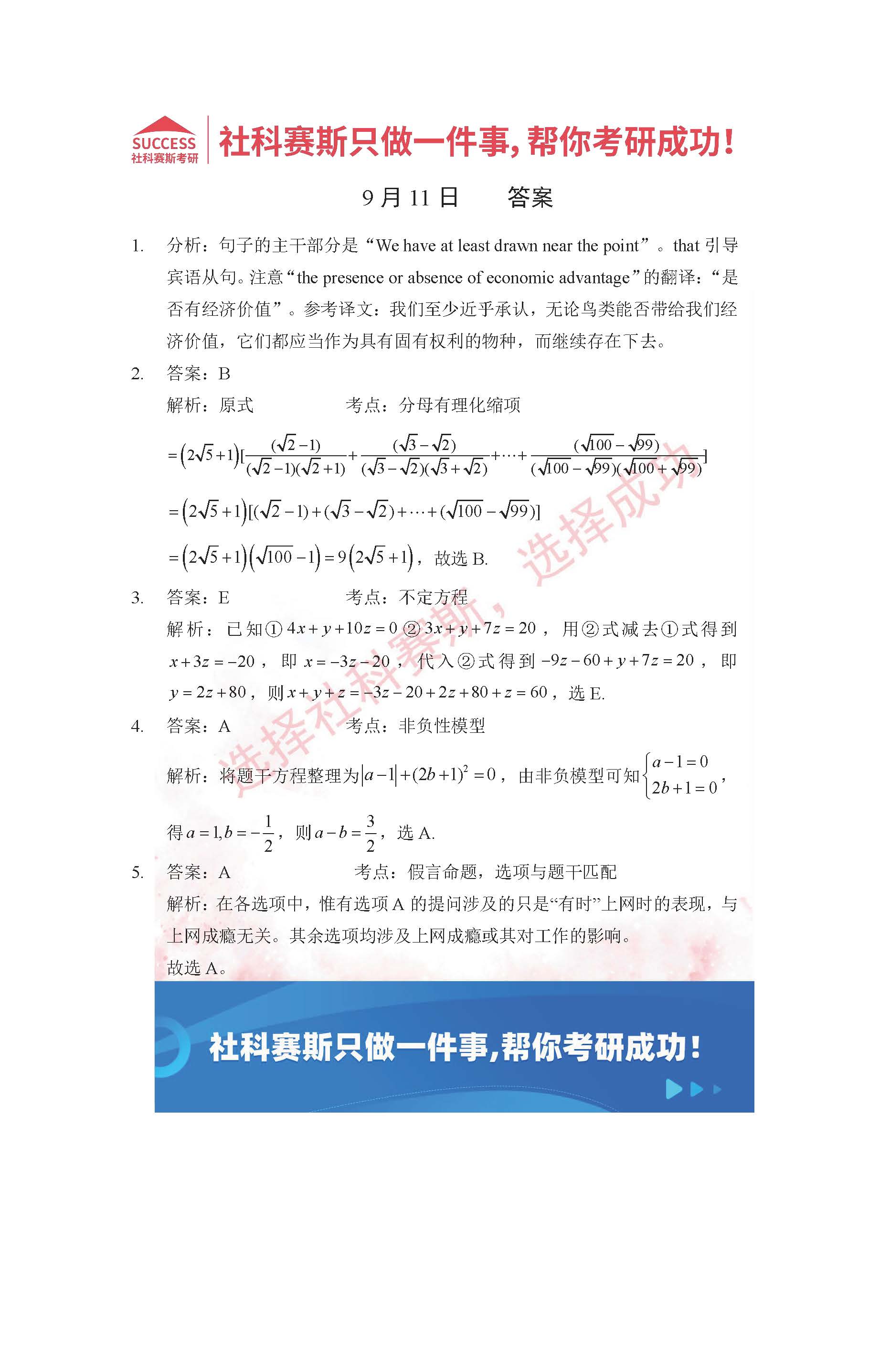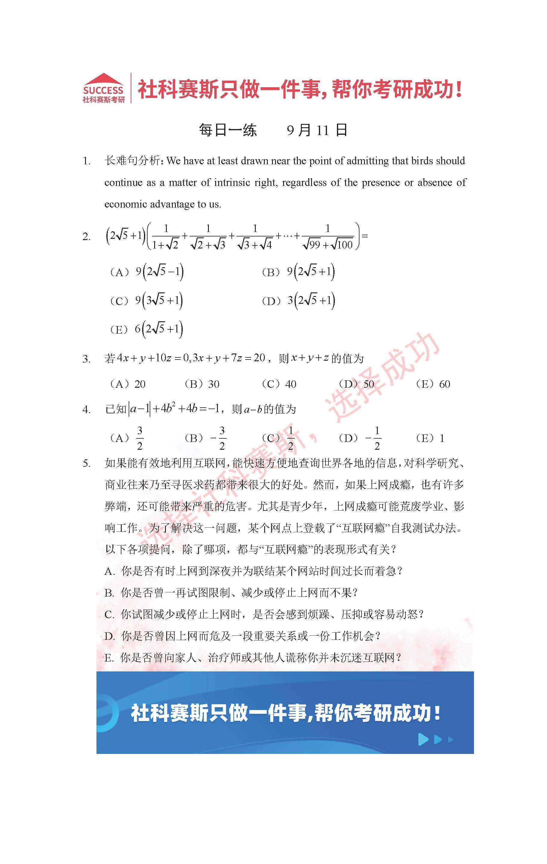 導(dǎo)讀:考研是一場持久戰(zhàn),保持良好的學(xué)習(xí)習(xí)慣,是能確保復(fù)習(xí)高效的關(guān)鍵。今天社科賽斯MBA備考網(wǎng)小編整理了“2022管理類聯(lián)考9月11日每日一練及答案”的內(nèi)容,希望能對廣大考生有所幫助。
