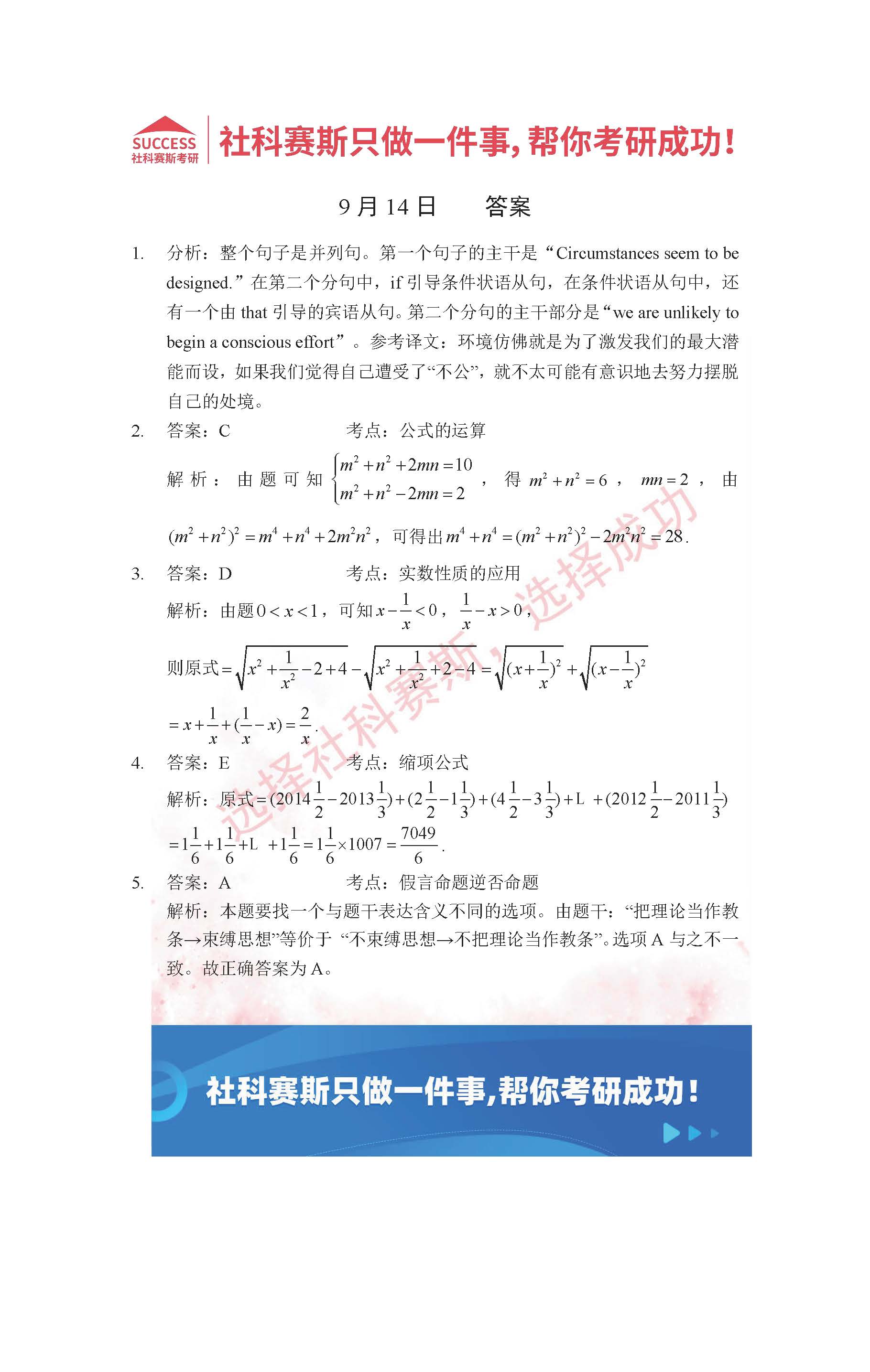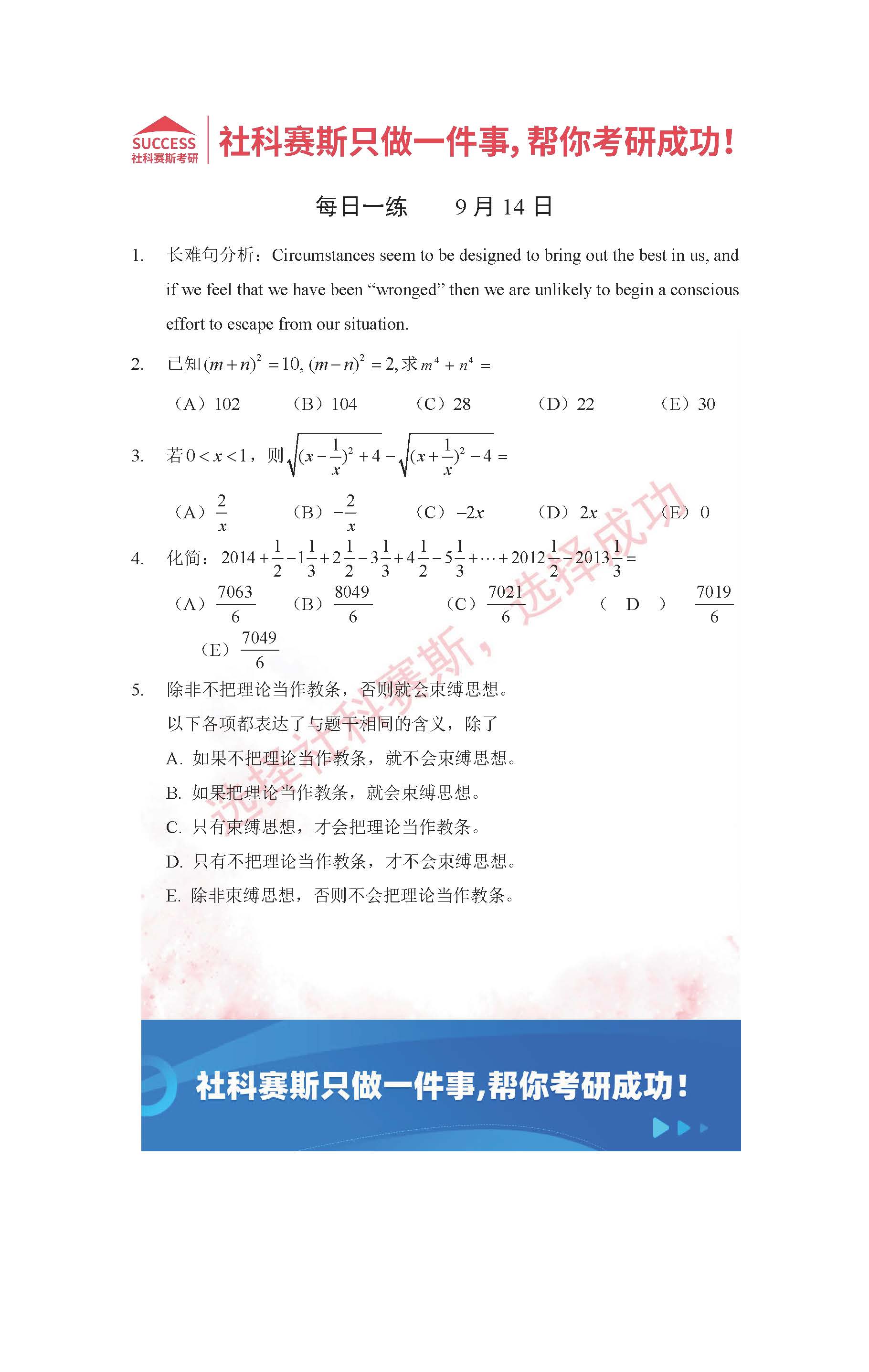 導(dǎo)讀:考研是一場(chǎng)持久戰(zhàn),保持良好的學(xué)習(xí)習(xí)慣,是能確保復(fù)習(xí)高效的關(guān)鍵。今天社科賽斯MBA備考網(wǎng)小編整理了“2022管理類(lèi)聯(lián)考9月14日每日一練及答案”的內(nèi)容,希望能對(duì)廣大考生有所幫助。