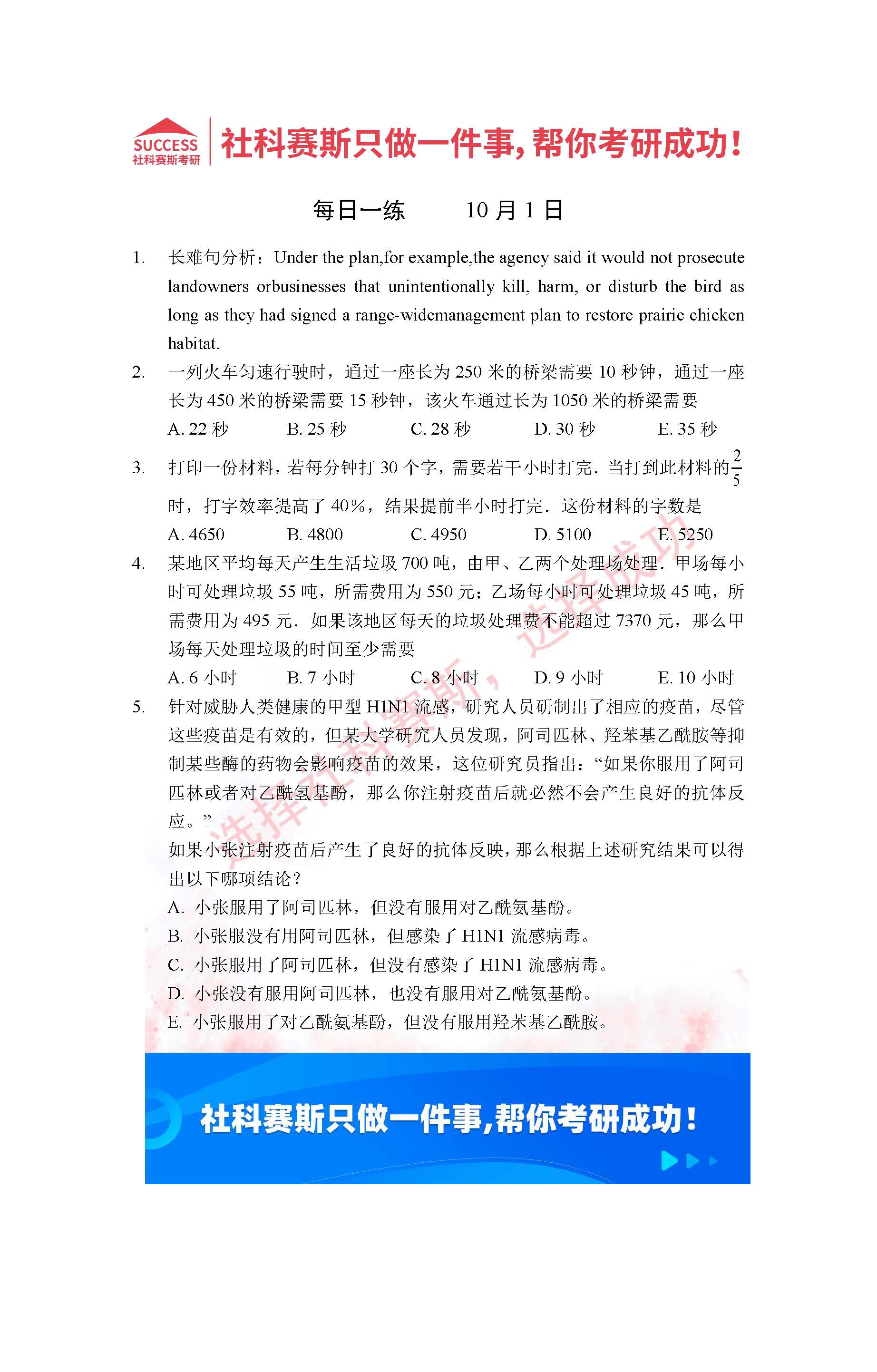 導(dǎo)讀:考研是一場(chǎng)持久戰(zhàn),保持良好的學(xué)習(xí)習(xí)慣,是能確保復(fù)習(xí)高效的關(guān)鍵。今天社科賽斯MBA備考網(wǎng)小編整理了“2022管理類聯(lián)考10月1日每日一練及答案”的內(nèi)容,希望能對(duì)廣大考生有所幫助。