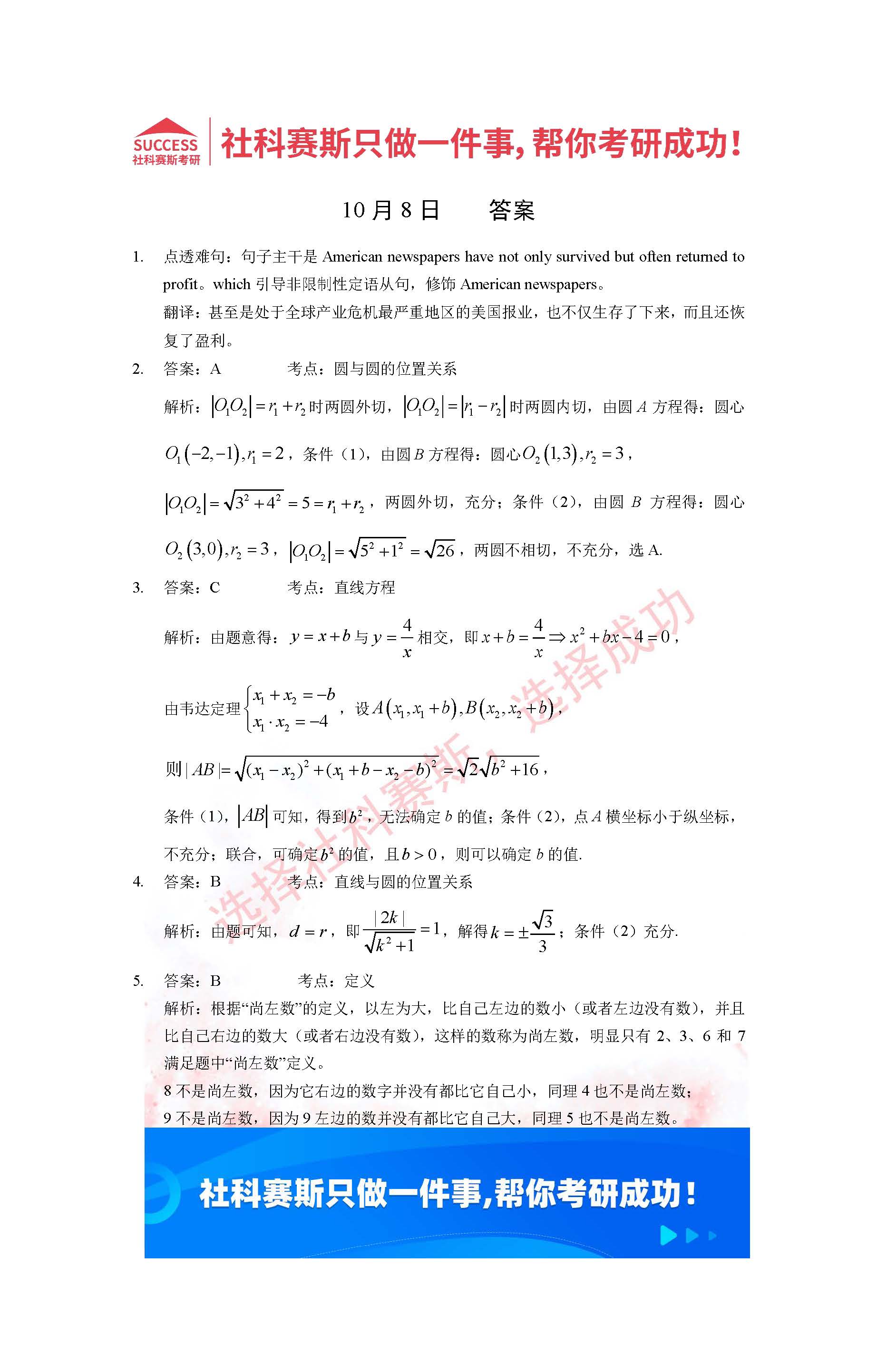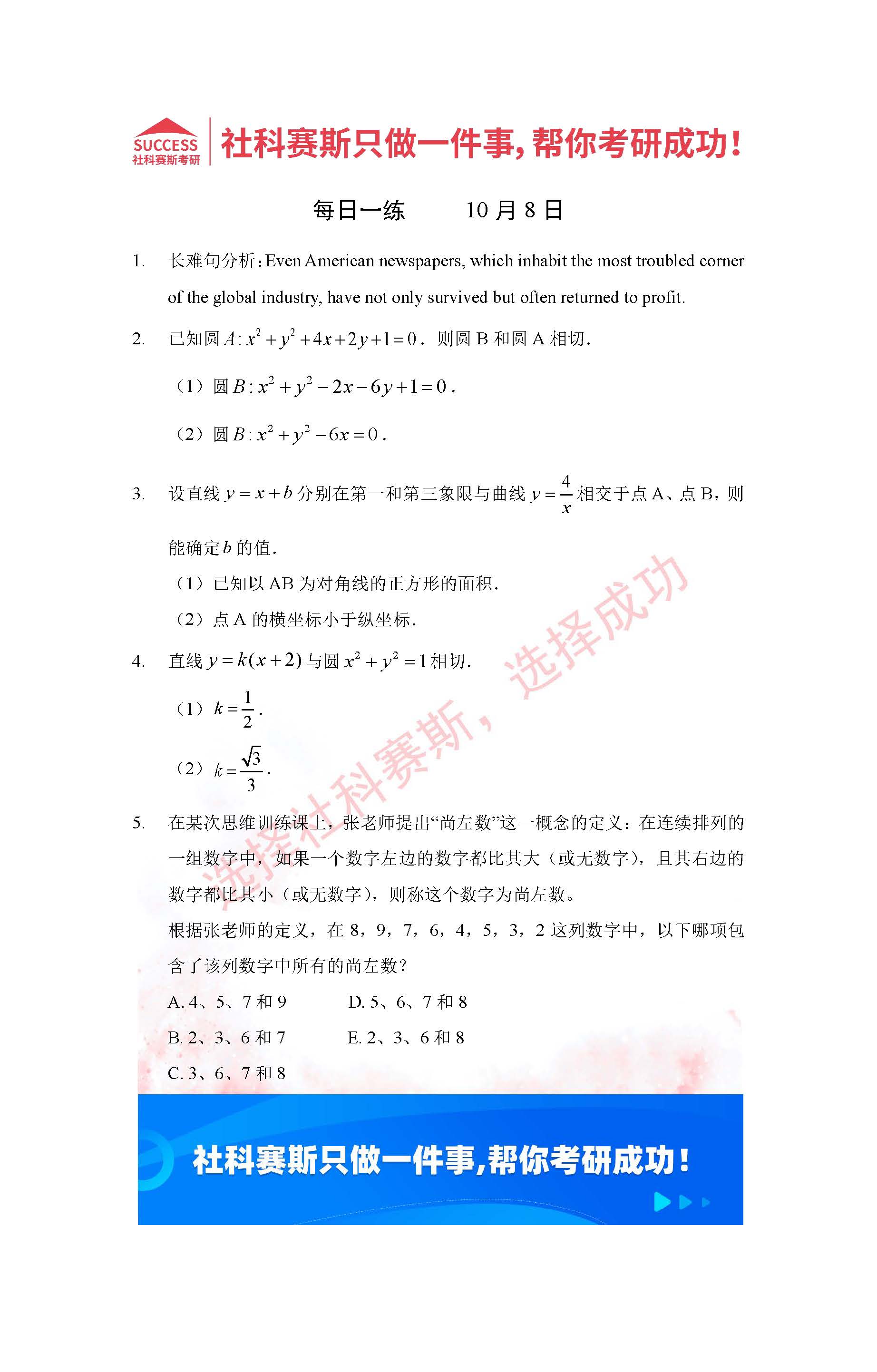 導(dǎo)讀:考研是一場持久戰(zhàn),保持良好的學(xué)習(xí)習(xí)慣,是能確保復(fù)習(xí)高效的關(guān)鍵。今天社科賽斯MBA備考網(wǎng)小編整理了“2022管理類聯(lián)考10月8日每日一練及答案”的內(nèi)容,希望能對廣大考生有所幫助。