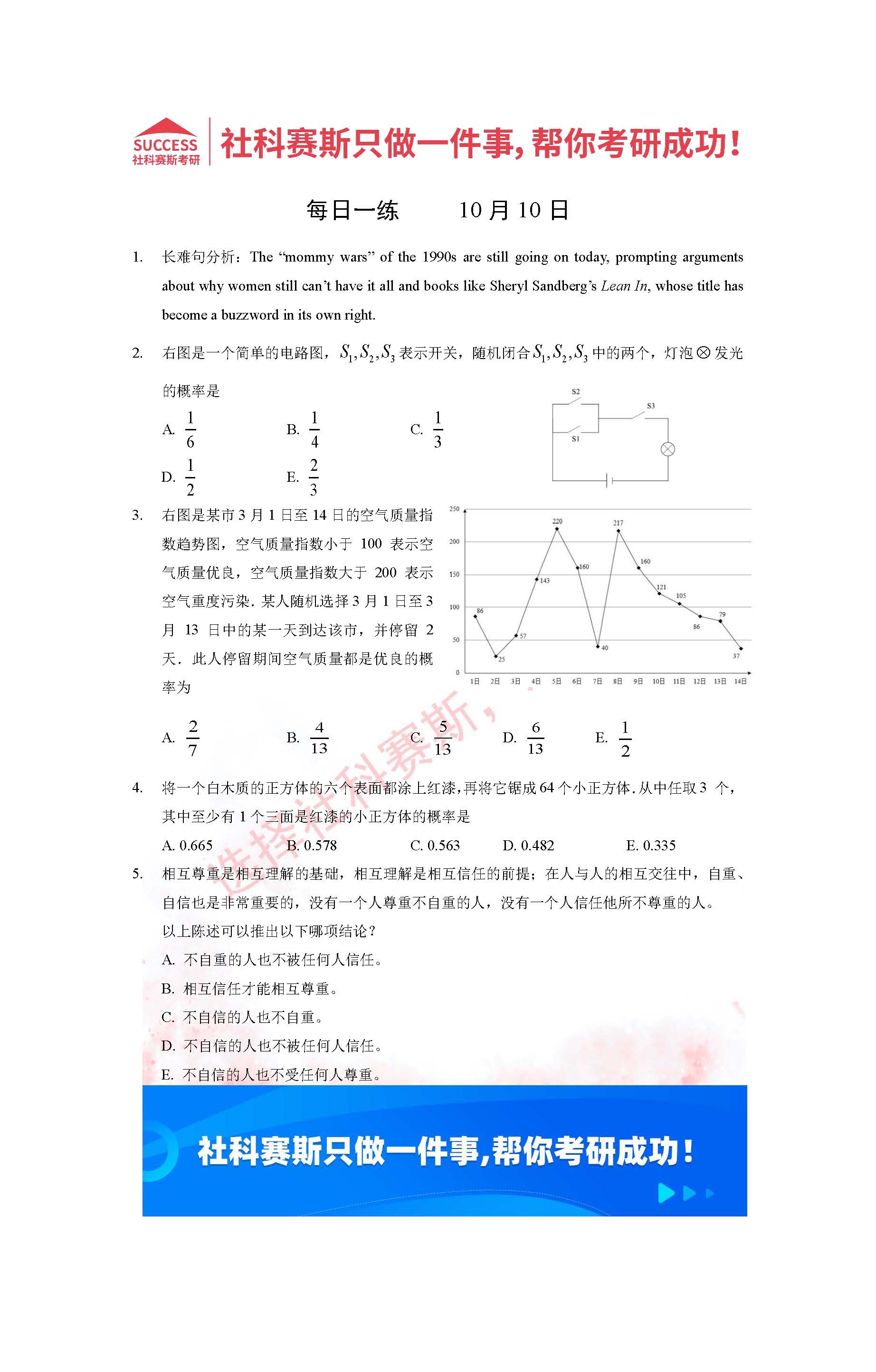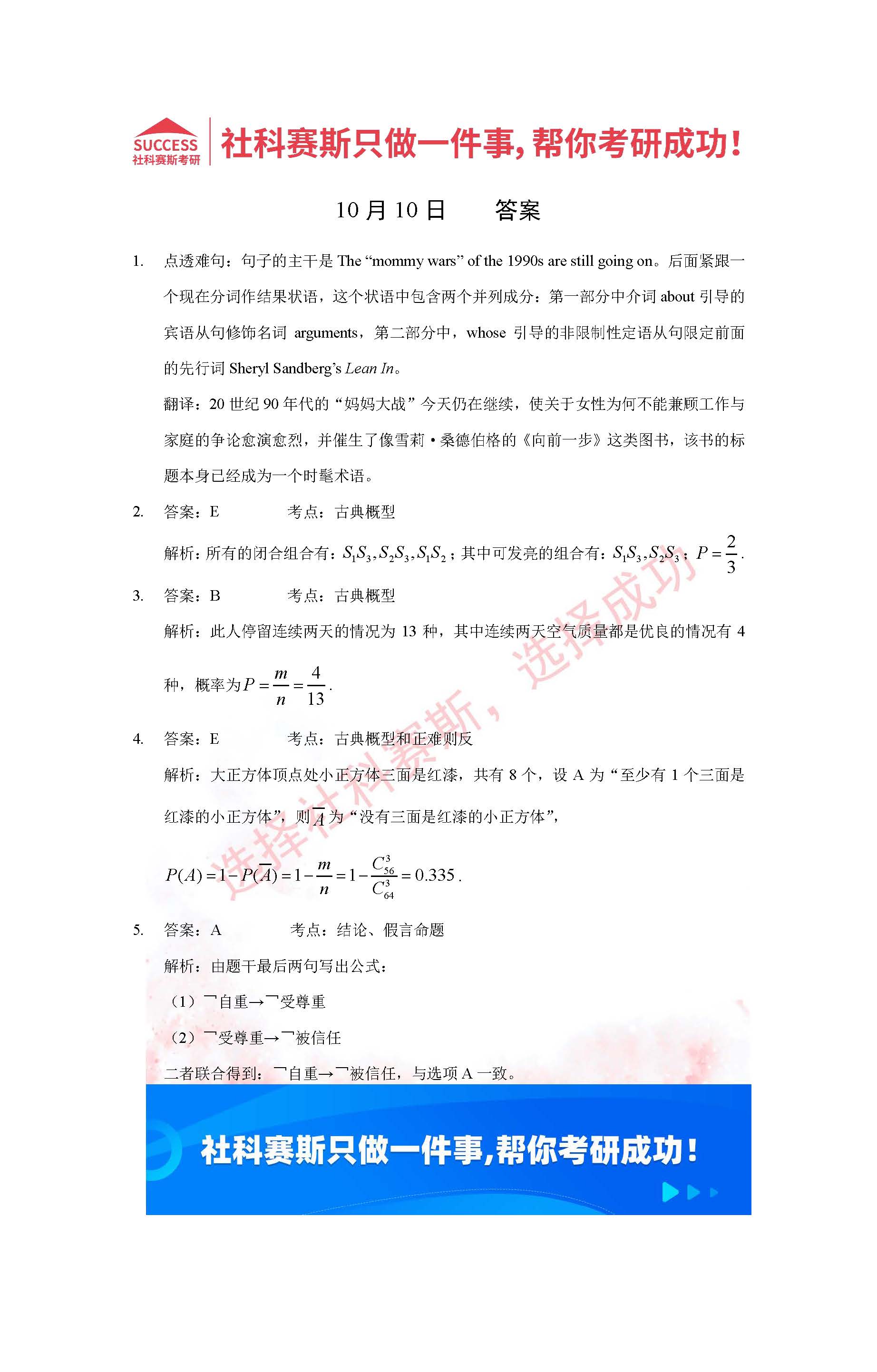 導(dǎo)讀:考研是一場持久戰(zhàn),保持良好的學(xué)習(xí)習(xí)慣,是能確保復(fù)習(xí)高效的關(guān)鍵。今天社科賽斯MBA備考網(wǎng)小編整理了“2022管理類聯(lián)考10月10日每日一練及答案”的內(nèi)容,希望能對廣大考生有所幫助。