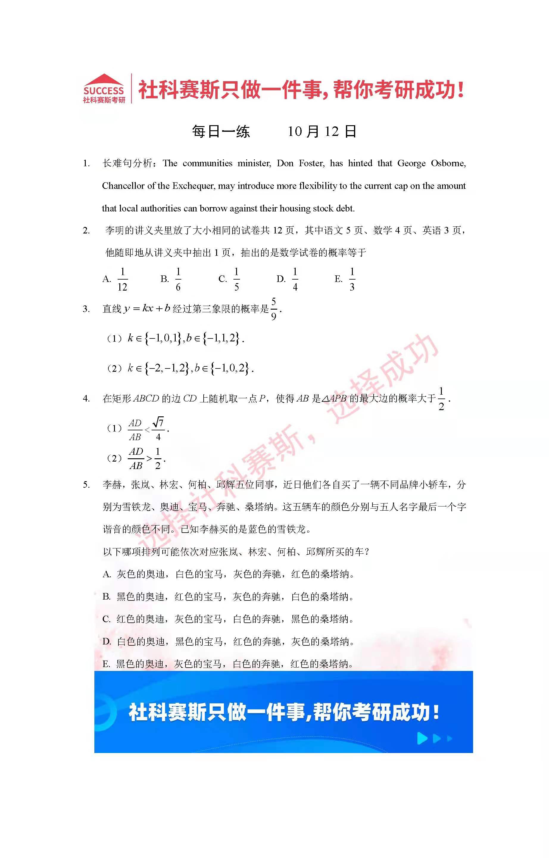 導(dǎo)讀:考研是一場持久戰(zhàn),保持良好的學(xué)習(xí)習(xí)慣,是能確保復(fù)習(xí)高效的關(guān)鍵。今天社科賽斯MBA備考網(wǎng)小編整理了“2022管理類聯(lián)考10月12日每日一練及答案”的內(nèi)容,希望能對廣大考生有所幫助。