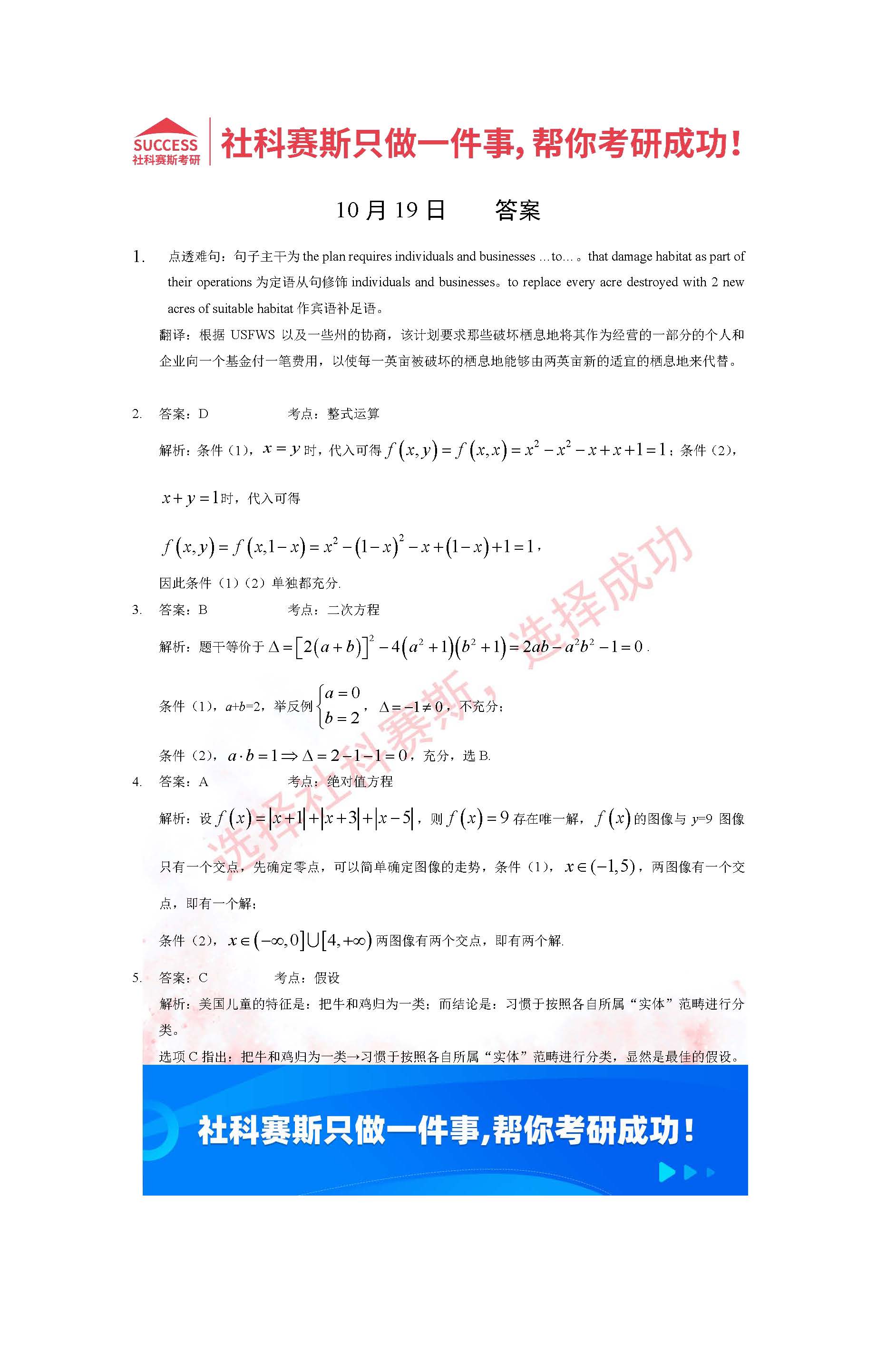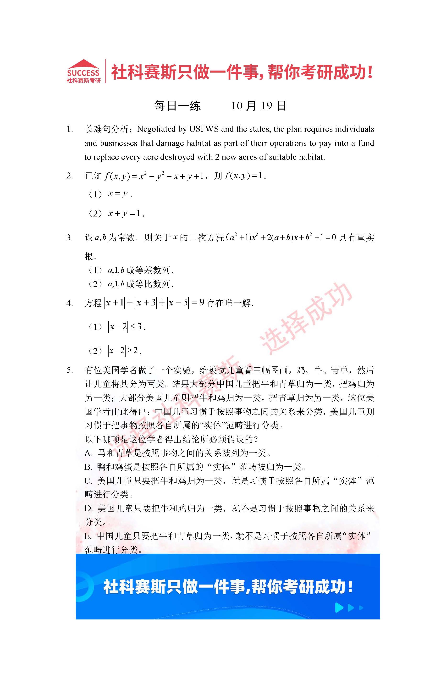 導(dǎo)讀:考研是一場(chǎng)持久戰(zhàn),保持良好的學(xué)習(xí)習(xí)慣,是能確保復(fù)習(xí)高效的關(guān)鍵。今天社科賽斯MBA備考網(wǎng)小編整理了“2022管理類聯(lián)考10月19日每日一練及答案”的內(nèi)容,希望能對(duì)廣大考生有所幫助。