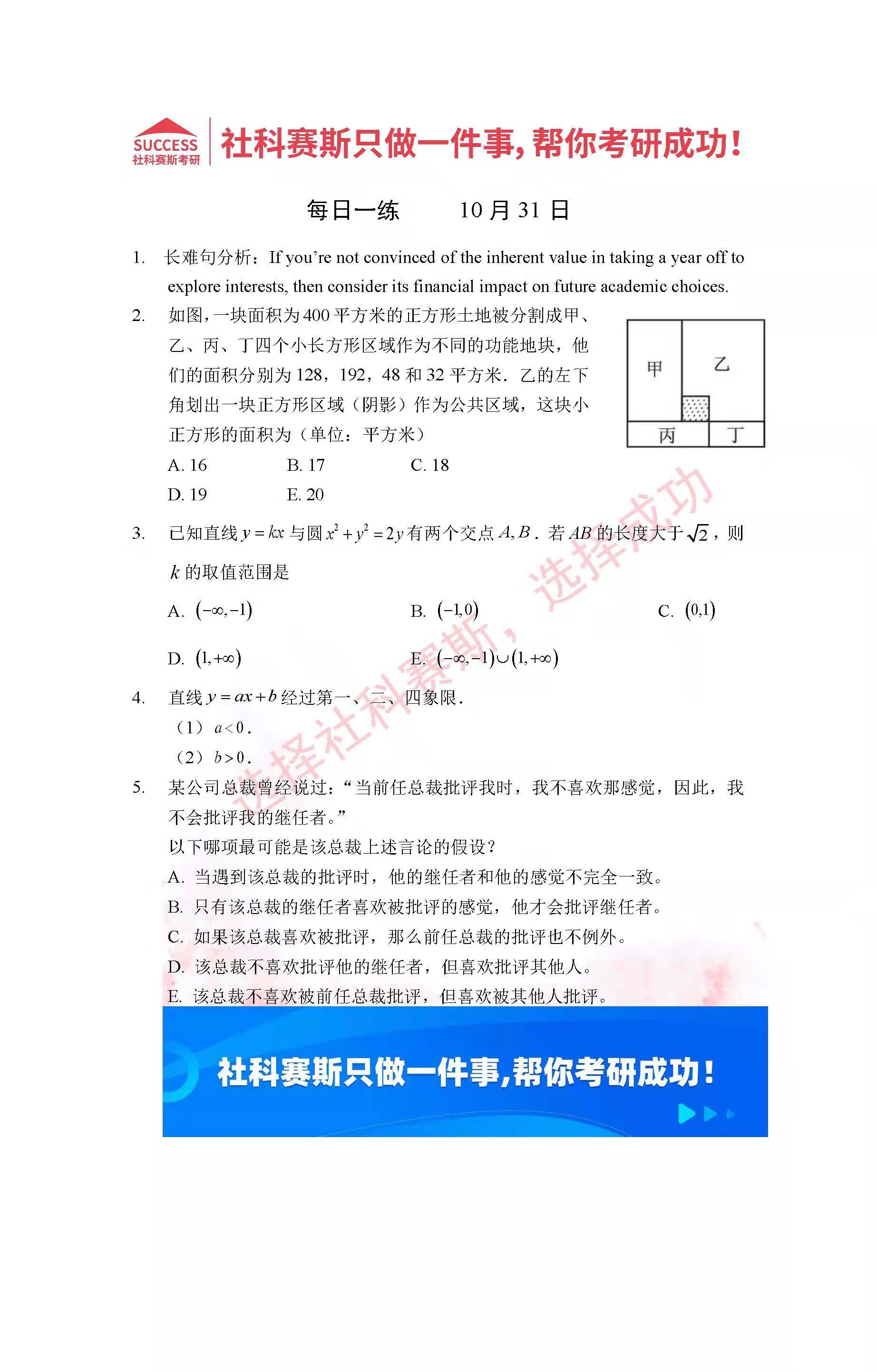 首頁> 管理類聯(lián)考每日一練 > 2022管理類聯(lián)考10月31日每日一練及答案