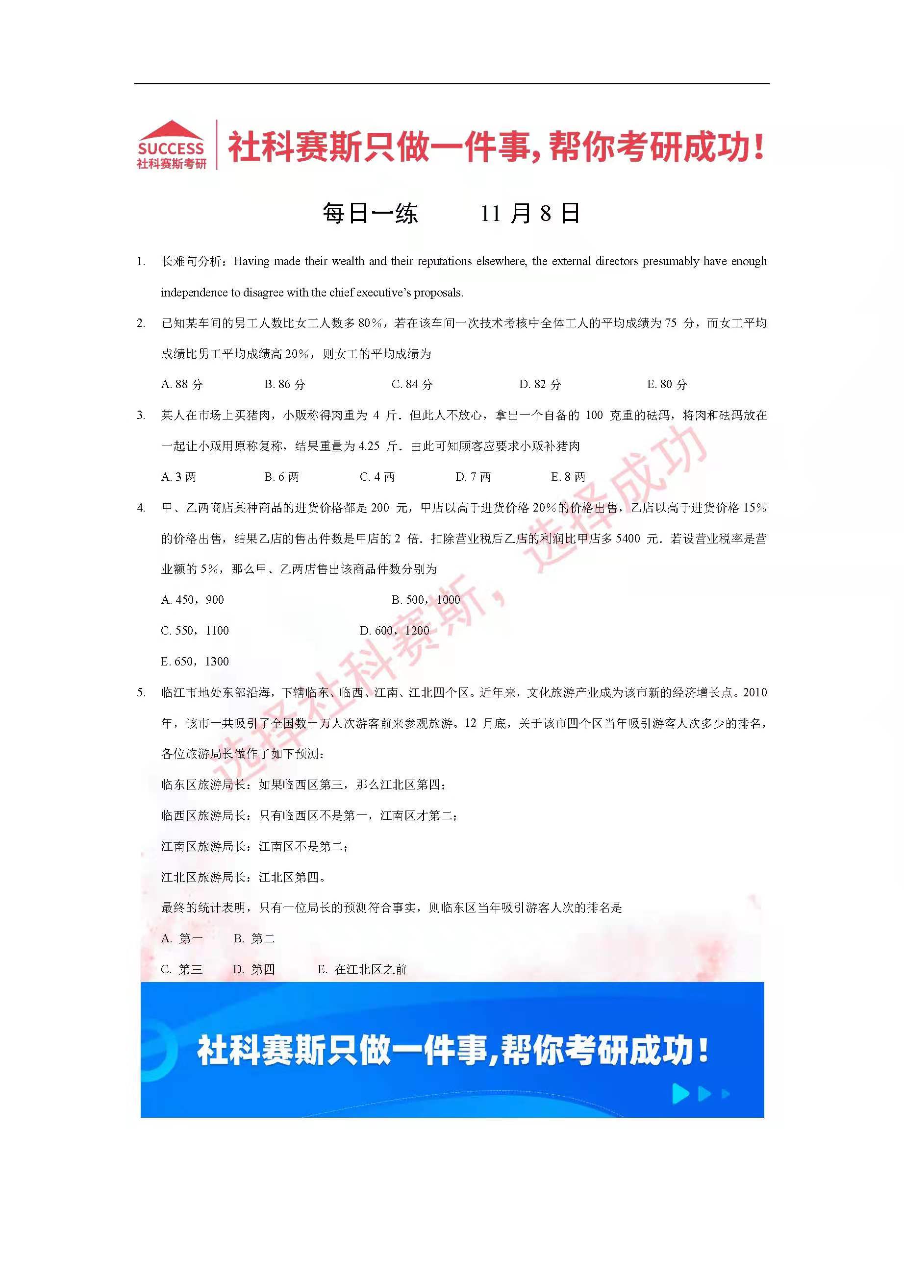 導(dǎo)讀:考研是一場持久戰(zhàn),保持良好的學(xué)習(xí)習(xí)慣,是能確保復(fù)習(xí)高效的關(guān)鍵。今天社科賽斯MBA備考網(wǎng)小編整理了“2022管理類聯(lián)考11月8日每日一練及答案”的內(nèi)容,希望能對廣大考生有所幫助。
