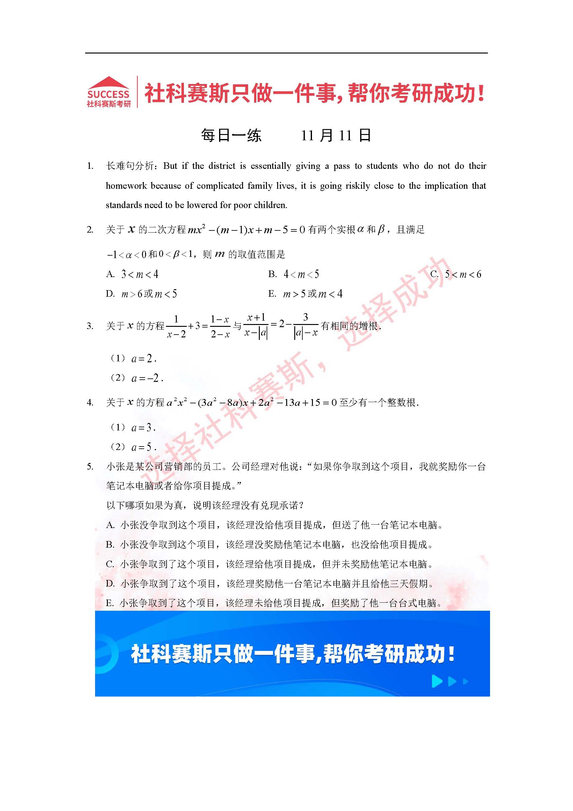 導(dǎo)讀:考研是一場持久戰(zhàn),保持良好的學(xué)習(xí)習(xí)慣,是能確保復(fù)習(xí)高效的關(guān)鍵。今天社科賽斯MBA備考網(wǎng)小編整理了“2022管理類聯(lián)考11月11日每日一練及答案”的內(nèi)容,希望能對廣大考生有所幫助。